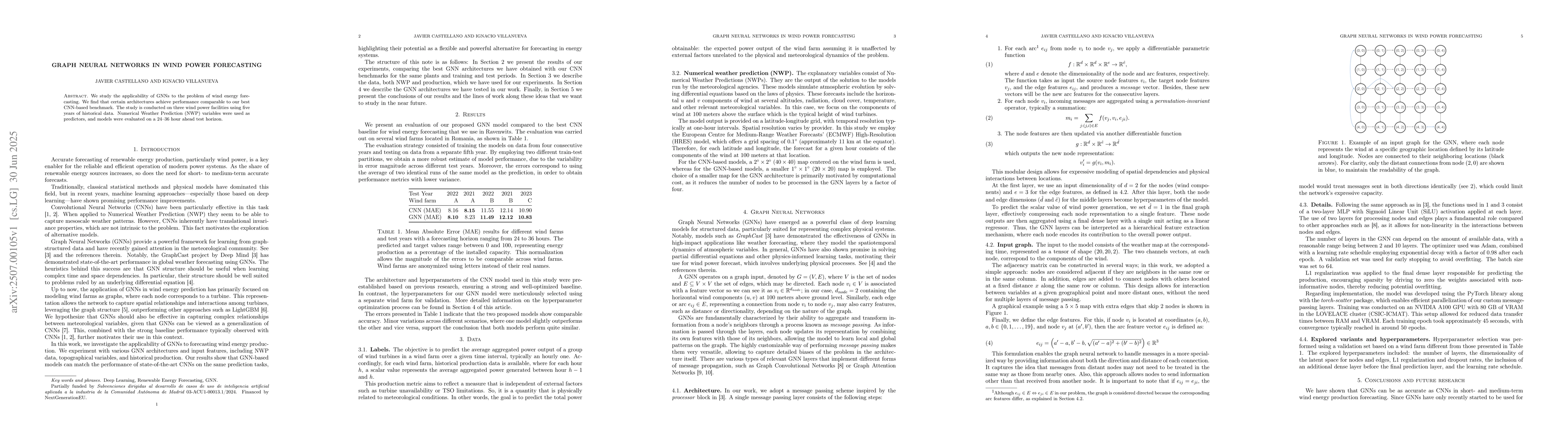 We study the applicability of GNNs to the problem of wind energy forecasting. We find that certain architectures achieve performance comparable to our best CNN-based benchmark. The study is conducted on three wind power facilities using five years of historical data. Numerical Weather Prediction (NWP) variables were used as predictors, and models were evaluated on a 24 to 36 hour ahead test horizon.
