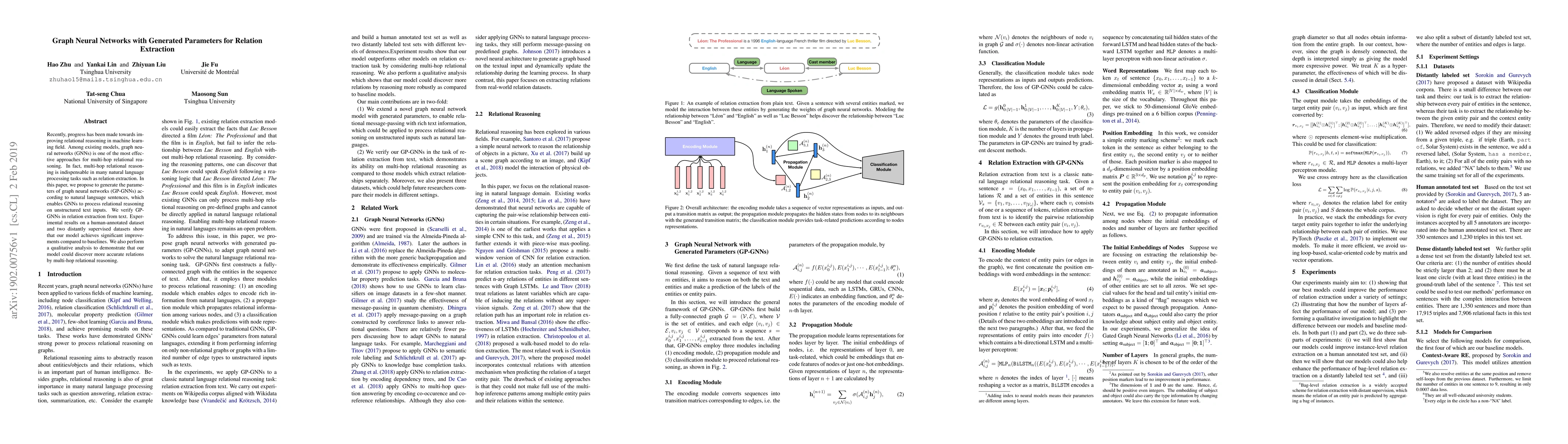 This paper proposes Graph Neural Networks with Generated Parameters (GP-GNNs) for relation extraction, enabling GNNs to process relational reasoning from unstructured text inputs. Experimental results show significant improvements over baselines and qualitative analysis indicates more accurate relation discovery through multi-hop reasoning.