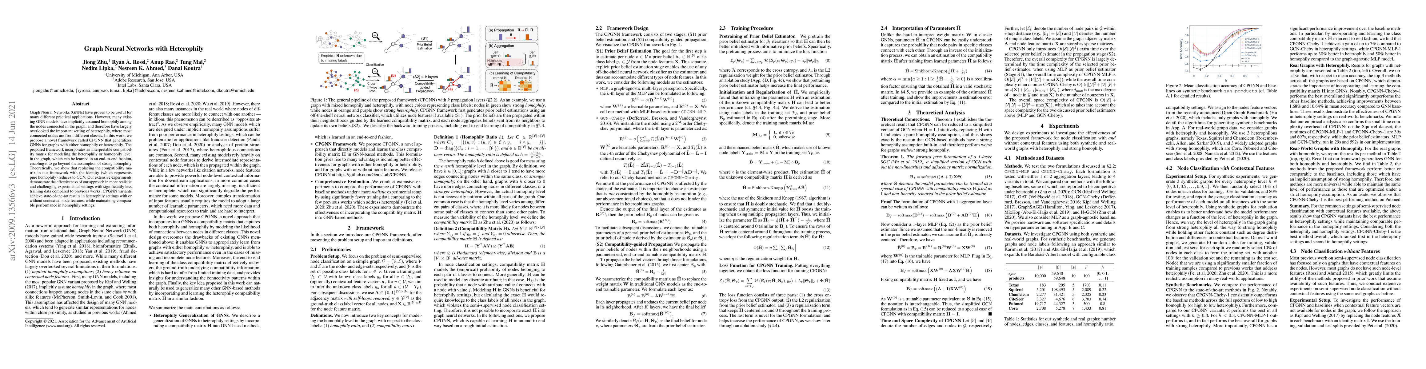 This paper proposes CPGNN, a novel framework that generalizes Graph Neural Networks (GNNs) to handle both homophily and heterophily in graphs. It introduces an interpretable compatibility matrix that can be learned to model the level of heterophily or homophily, achieving state-of-the-art results in heterophily settings while maintaining comparable performance in homophily settings.