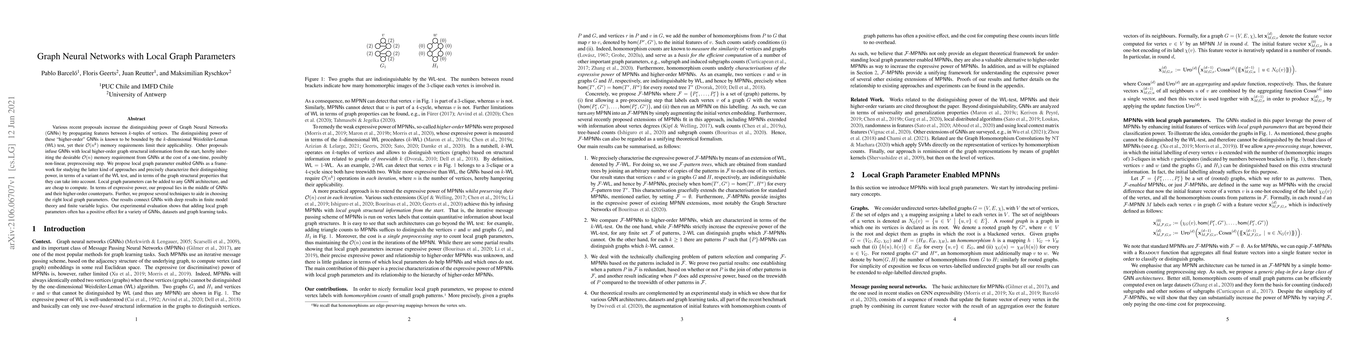 Various recent proposals increase the distinguishing power of Graph Neural Networks GNNs by propagating features between $k$-tuples of vertices. The distinguishing power of these "higher-order'' GNNs is known to be bounded by the $k$-dimensional Weisfeiler-Leman (WL) test, yet their $\mathcal O(n^k)$ memory requirements limit their applicability. Other proposals infuse GNNs with local higher-order graph structural information from the start, hereby inheriting the desirable $\mathcal O(n)$ memory requirement from GNNs at the cost of a one-time, possibly non-linear, preprocessing step. We propose local graph parameter enabled GNNs as a framework for studying the latter kind of approaches and precisely characterize their distinguishing power, in terms of a variant of the WL test, and in terms of the graph structural properties that they can take into account. Local graph parameters can be added to any GNN architecture, and are cheap to compute. In terms of expressive power, our proposal lies in the middle of GNNs and their higher-order counterparts. Further, we propose several techniques to aide in choosing the right local graph parameters. Our results connect GNNs with deep results in finite model theory and finite variable logics. Our experimental evaluation shows that adding local graph parameters often has a positive effect for a variety of GNNs, datasets and graph learning tasks.