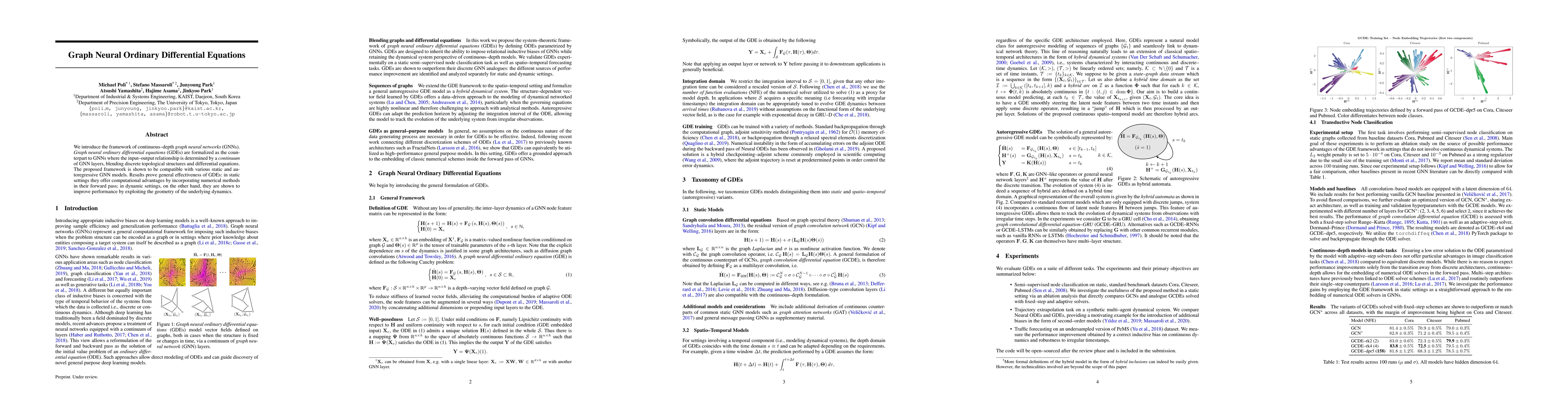 The paper introduces graph neural ordinary differential equations (GDEs) as continuous-depth graph neural networks that combine discrete graph structures with differential equations, offering computational benefits in static settings and improved performance in dynamic scenarios. The framework is shown to be compatible with various existing GNN models.