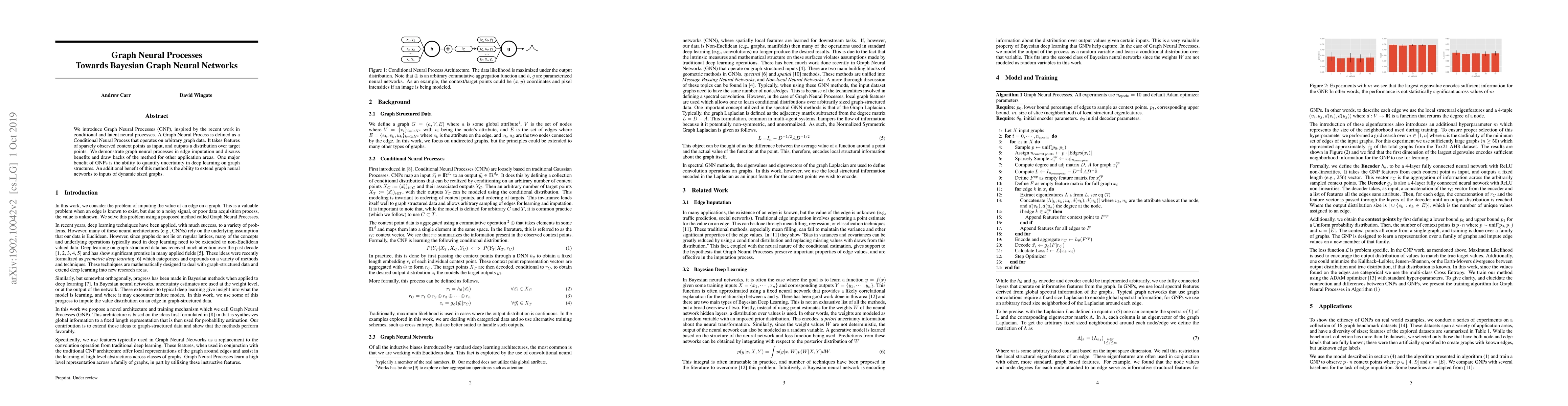 Graph Neural Processes (GNP) extend conditional neural processes to handle graph data, offering a method to quantify uncertainty in graph-based deep learning. This approach enables dynamic-sized graph inputs and demonstrates potential in edge imputation, with both benefits and limitations for broader applications.