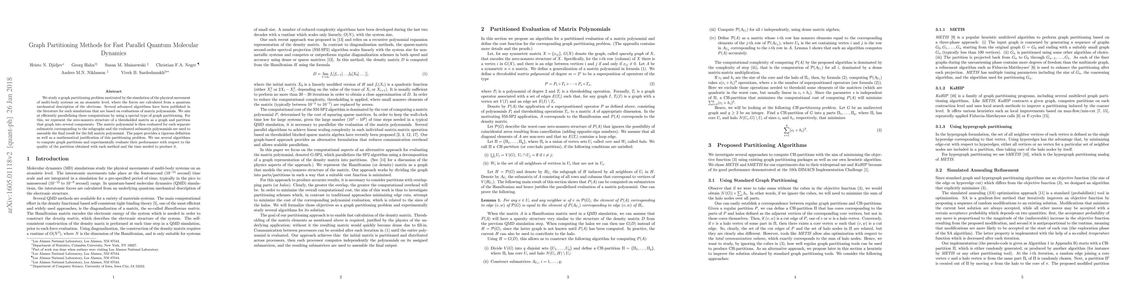 This paper explores advanced graph partitioning methods to efficiently parallelize quantum molecular dynamics simulations, representing matrix structures as graphs and partitioning them to evaluate matrix polynomials in parallel. The study rigorously defines the partitioning problem and evaluates various algorithms for their partition quality and computational time.