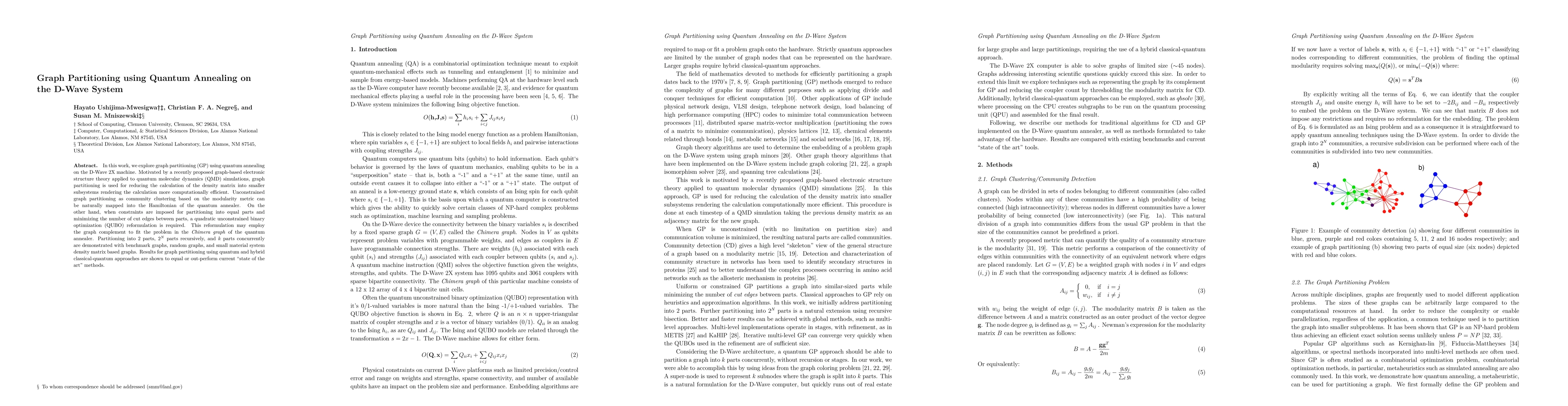 This paper investigates graph partitioning for efficient quantum molecular dynamics simulations using quantum annealing on the D-Wave 2X system. It demonstrates both unconstrained and constrained partitioning methods, achieving results that match or exceed existing computational techniques.