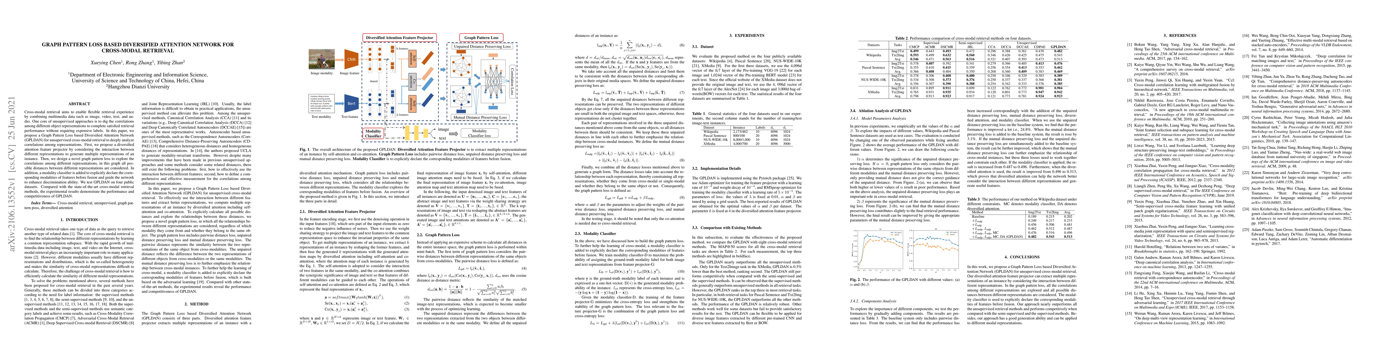 This paper proposes a Graph Pattern Loss based Diversified Attention Network (GPLDAN) for unsupervised cross-modal retrieval, utilizing diversified attention to generate multiple representations and a graph pattern loss to explore correlations among different modalities. Experimental results show GPLDAN's competitive performance against state-of-the-art methods.