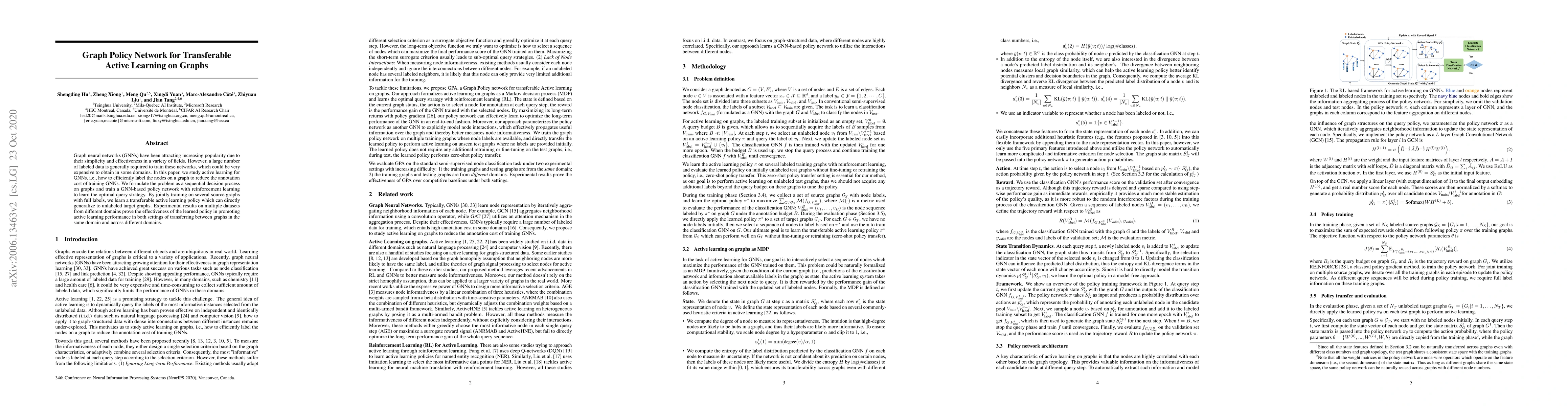 This paper proposes a Graph Policy Network using reinforcement learning to optimize active learning for graph neural networks (GNNs), reducing the need for expensive labeled data. The method learns a transferable active learning policy that generalizes to new, unlabeled graphs across different domains, as demonstrated by improved performance on various datasets.