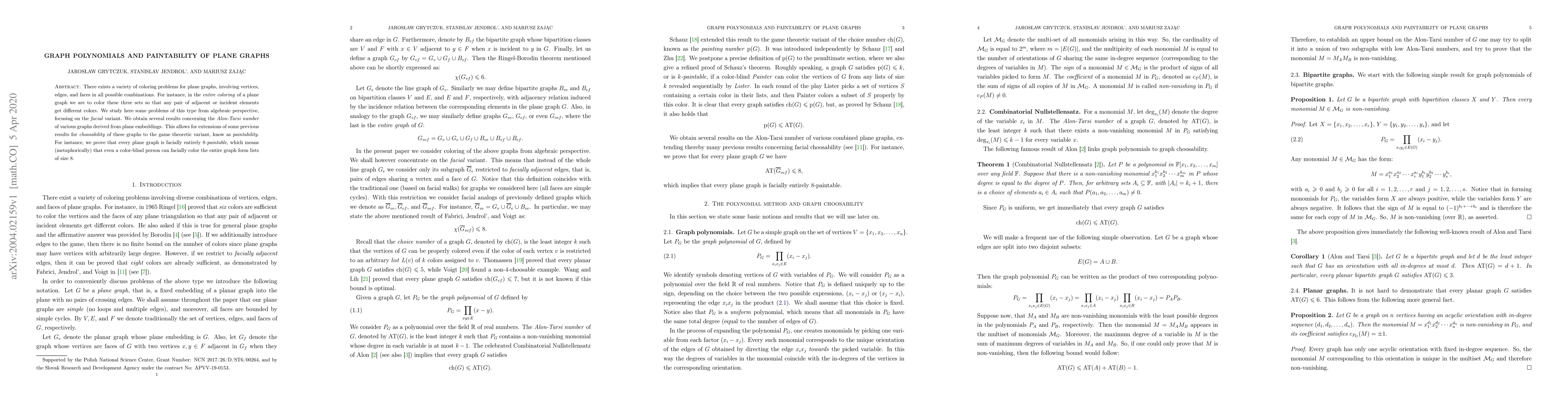 This paper explores algebraic approaches to coloring problems in plane graphs, specifically focusing on the "facial" variant where vertices, edges, and faces must be colored such that adjacent elements differ. It introduces results regarding the Alon-Tarsi number and demonstrates that every plane graph is facially entirely 8-paintable, implying that any such graph can be colored using a list of 8 colors.