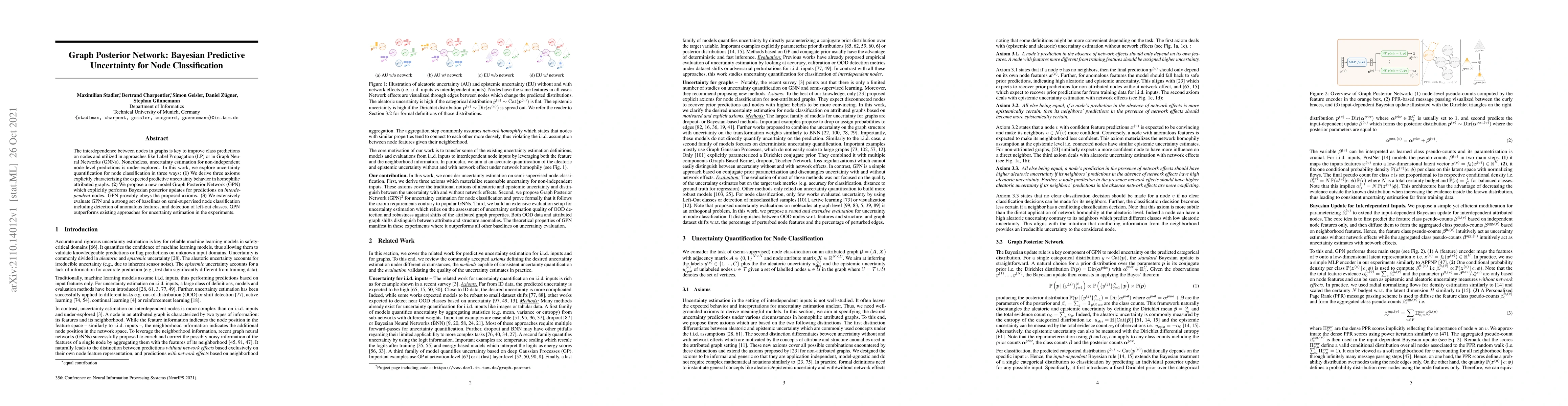 The interdependence between nodes in graphs is key to improve class predictions on nodes and utilized in approaches like Label Propagation (LP) or in Graph Neural Networks (GNN). Nonetheless, uncertainty estimation for non-independent node-level predictions is under-explored. In this work, we explore uncertainty quantification for node classification in three ways: (1) We derive three axioms explicitly characterizing the expected predictive uncertainty behavior in homophilic attributed graphs. (2) We propose a new model Graph Posterior Network (GPN) which explicitly performs Bayesian posterior updates for predictions on interdependent nodes. GPN provably obeys the proposed axioms. (3) We extensively evaluate GPN and a strong set of baselines on semi-supervised node classification including detection of anomalous features, and detection of left-out classes. GPN outperforms existing approaches for uncertainty estimation in the experiments.