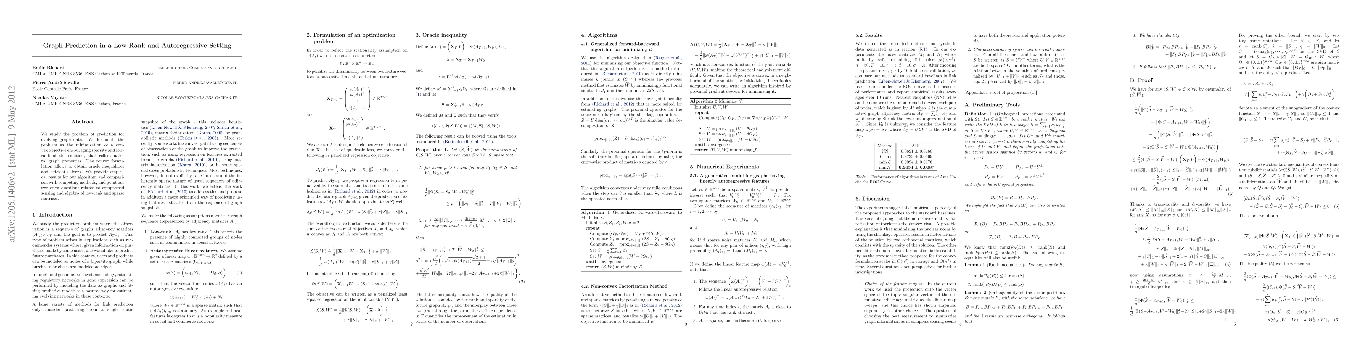 We study the problem of prediction for evolving graph data. We formulate the problem as the minimization of a convex objective encouraging sparsity and low-rank of the solution, that reflect natural graph properties. The convex formulation allows to obtain oracle inequalities and efficient solvers. We provide empirical results for our algorithm and comparison with competing methods, and point out two open questions related to compressed sensing and algebra of low-rank and sparse matrices.
