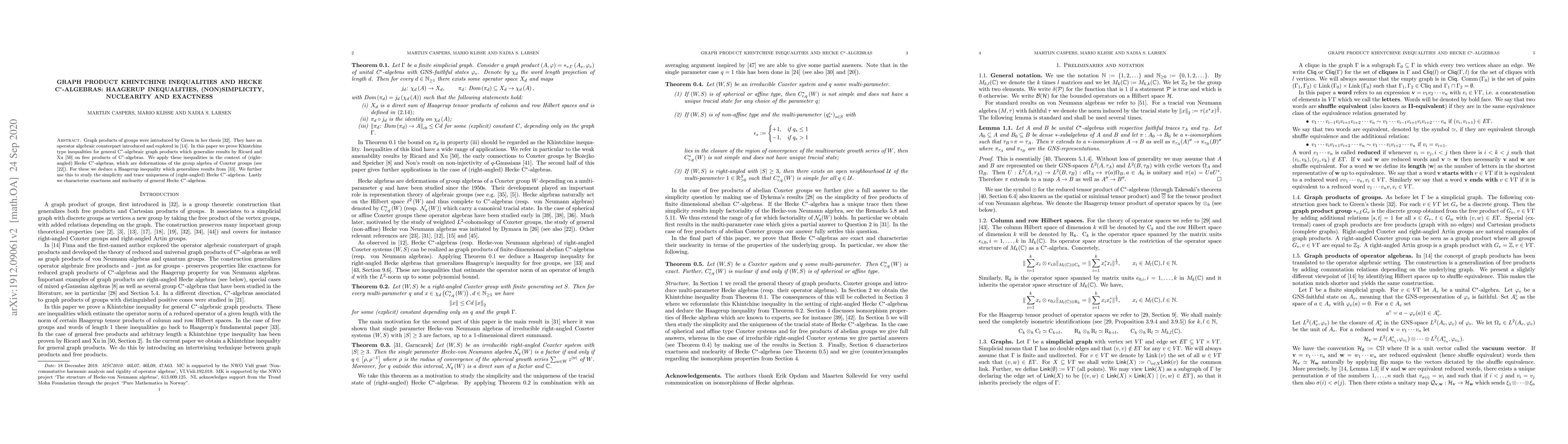This paper proves Khintchine inequalities for graph products of groups, generalizing previous results to C*-algebras, and applies them to study simplicity, uniqueness, exactness, and nuclearity of Hecke C*-algebras.