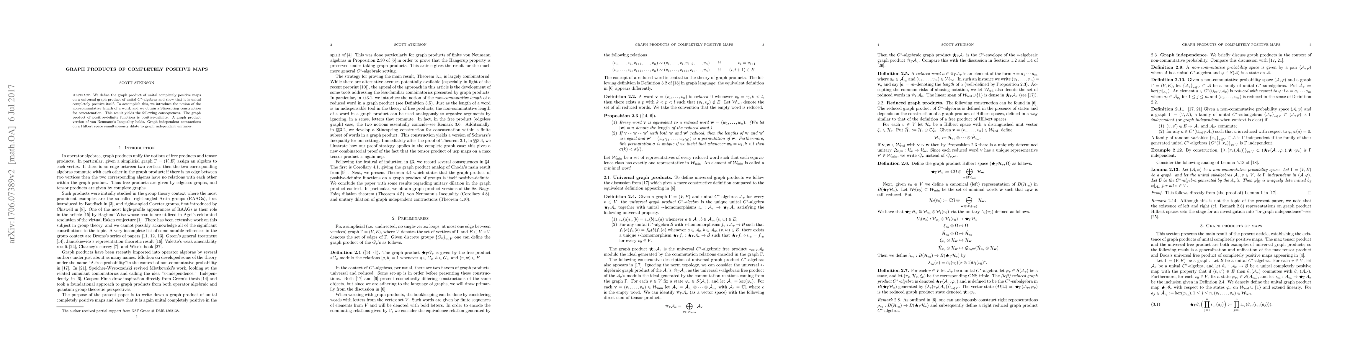 We define the graph product of unital completely positive maps on a universal graph product of unital C*-algebras and show that it is unital completely positive itself. To accomplish this, we introduce the notion of the non-commutative length of a word, and we obtain a Stinespring construction for concatenation. This result yields the following consequences. The graph product of positive-definite functions is positive-definite. A graph product version of von Neumann's Inequality holds. Graph independent contractions on a Hilbert space simultaneously dilate to graph independent unitaries.