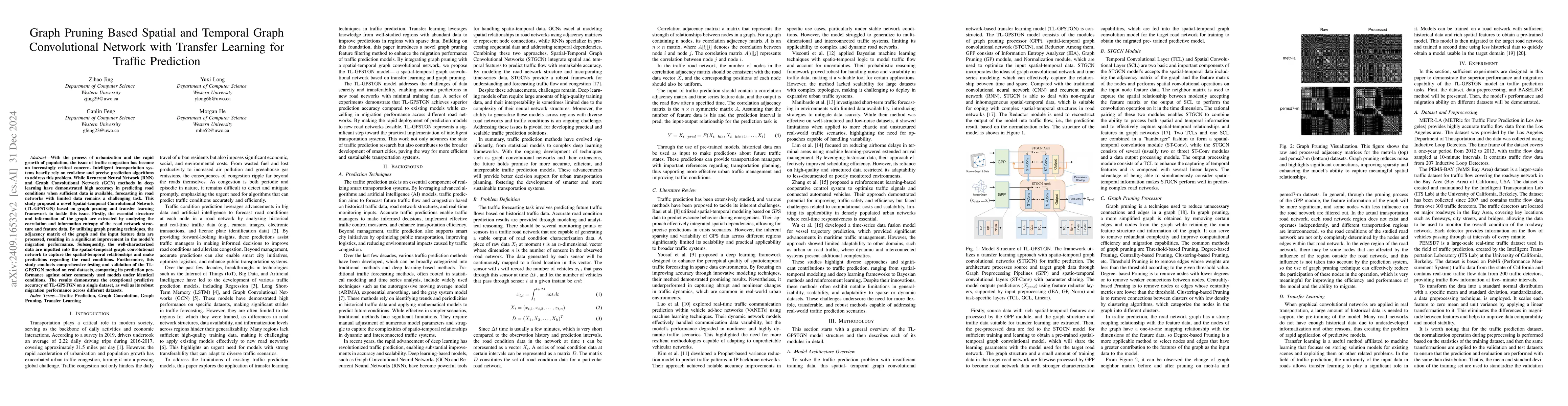 This study introduces a Spatial-temporal Graph Convolutional Network (TL-GPSTGN) with graph pruning and transfer learning to improve traffic prediction accuracy, especially in data-scarce road networks. The method significantly enhances model migration performance and demonstrates superior prediction accuracy compared to other models.