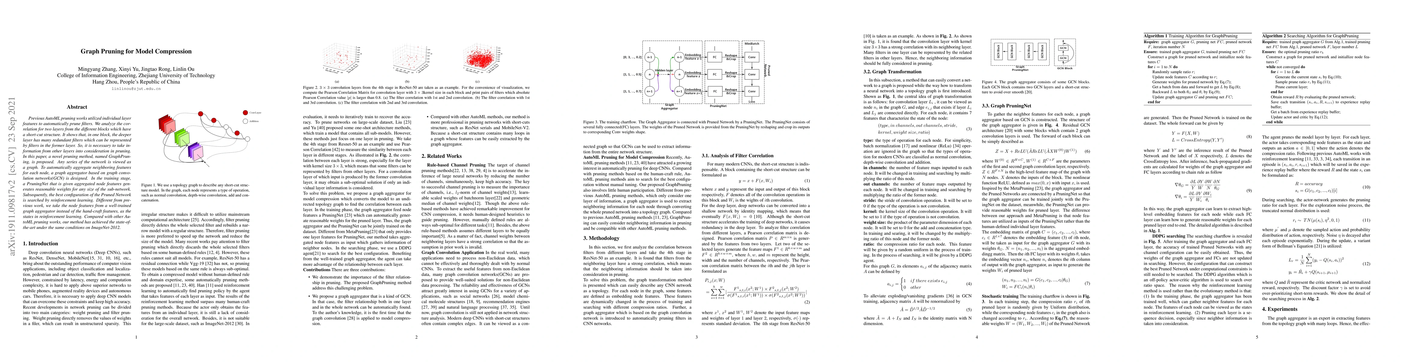 This paper introduces GraphPruning, a novel method for model compression that views network series as graphs. It uses a graph aggregator based on Graph Convolutional Networks (GCN) to aggregate neighboring features for each node. Unlike previous works, it employs features from a well-trained graph aggregator in reinforcement learning to find the optimal sub-network configuration. The method outperforms other AutoML pruning techniques on ImageNet-2012.