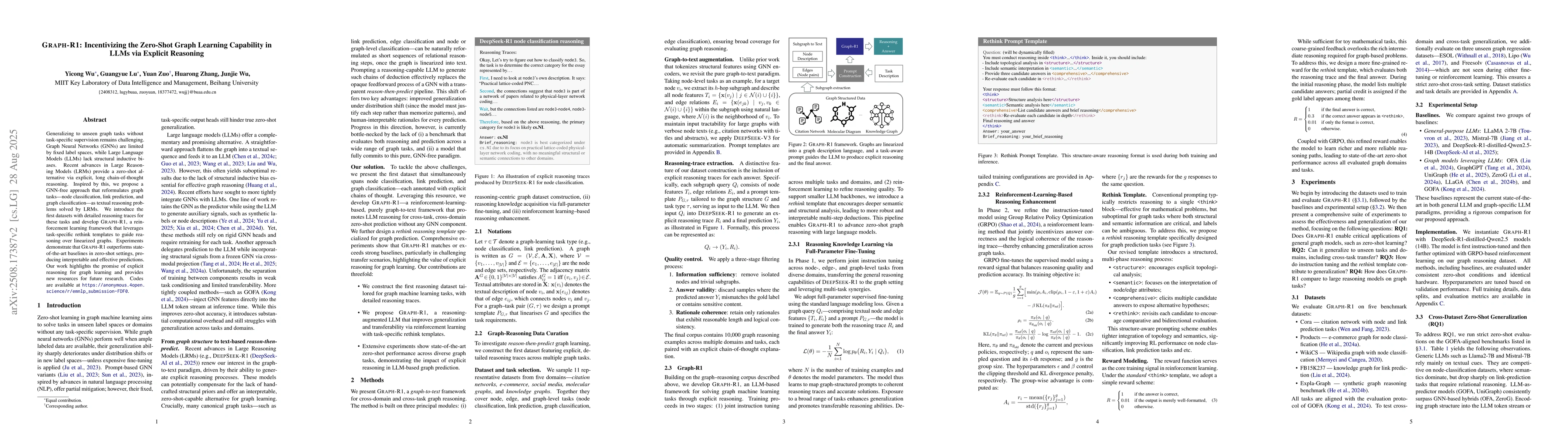 Generalizing to unseen graph tasks without task-pecific supervision remains challenging. Graph Neural Networks (GNNs) are limited by fixed label spaces, while Large Language Models (LLMs) lack structural inductive biases. Recent advances in Large Reasoning Models (LRMs) provide a zero-shot alternative via explicit, long chain-of-thought reasoning. Inspired by this, we propose a GNN-free approach that reformulates graph tasks--node classification, link prediction, and graph classification--as textual reasoning problems solved by LRMs. We introduce the first datasets with detailed reasoning traces for these tasks and develop Graph-R1, a reinforcement learning framework that leverages task-specific rethink templates to guide reasoning over linearized graphs. Experiments demonstrate that Graph-R1 outperforms state-of-the-art baselines in zero-shot settings, producing interpretable and effective predictions. Our work highlights the promise of explicit reasoning for graph learning and provides new resources for future research.