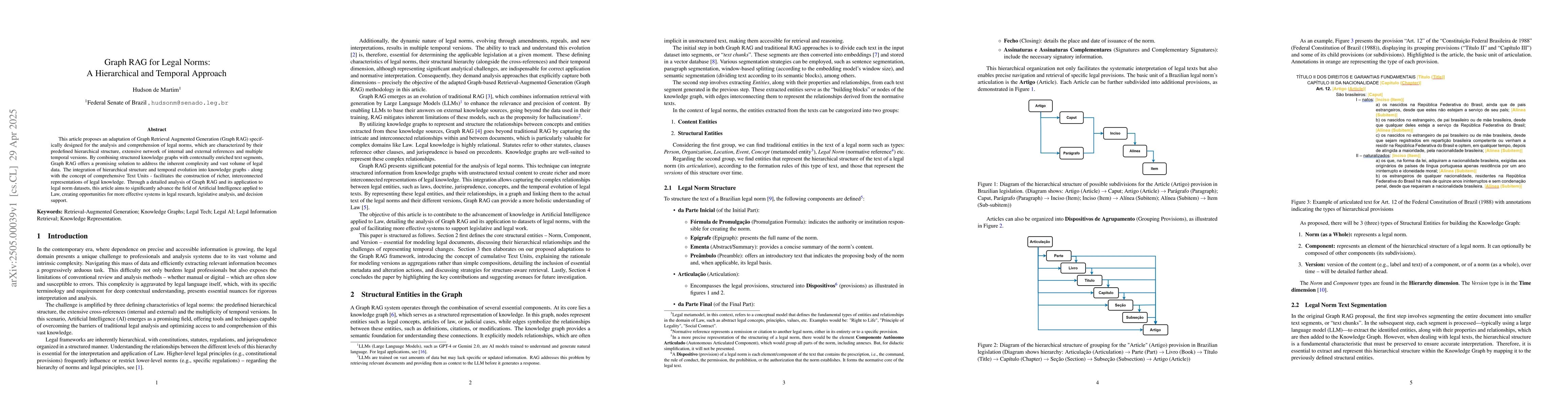 This article proposes an adaptation of Graph Retrieval Augmented Generation (Graph RAG) specifically designed for the analysis and comprehension of legal norms, which are characterized by their predefined hierarchical structure, extensive network of internal and external references and multiple temporal versions. By combining structured knowledge graphs with contextually enriched text segments, Graph RAG offers a promising solution to address the inherent complexity and vast volume of legal data. The integration of hierarchical structure and temporal evolution into knowledge graphs - along with the concept of comprehensive Text Units - facilitates the construction of richer, interconnected representations of legal knowledge. Through a detailed analysis of Graph RAG and its application to legal norm datasets, this article aims to significantly advance the field of Artificial Intelligence applied to Law, creating opportunities for more effective systems in legal research, legislative analysis, and decision support.