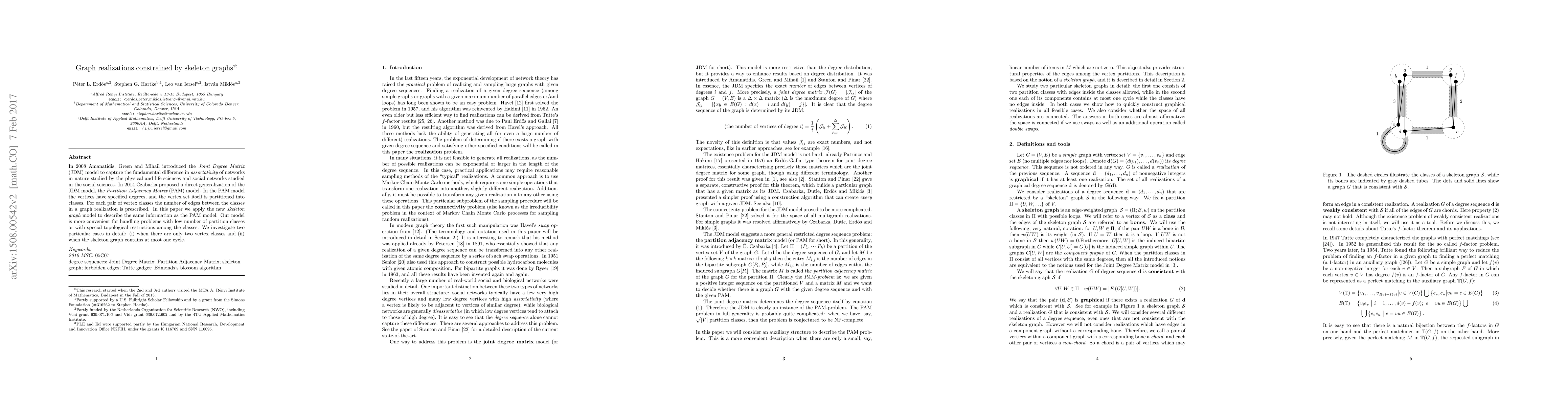 In 2008 Amanatidis, Green and Mihail introduced the Joint Degree Matrix (JDM) model to capture the fundamental difference in assortativity of networks in nature studied by the physical and life sciences and social networks studied in the social sciences. In 2014 Czabarka proposed a direct generalization of the JDM model, the Partition Adjacency Matrix (PAM) model. In the PAM model the vertices have specified degrees, and the vertex set itself is partitioned into classes. For each pair of vertex classes the number of edges between the classes in a graph realization is prescribed. In this paper we apply the new {\em skeleton graph} model to describe the same information as the PAM model. Our model is more convenient for handling problems with low number of partition classes or with special topological restrictions among the classes. We investigate two particular cases in detail: (i) when there are only two vertex classes and (ii) when the skeleton graph contains at most one cycle.
