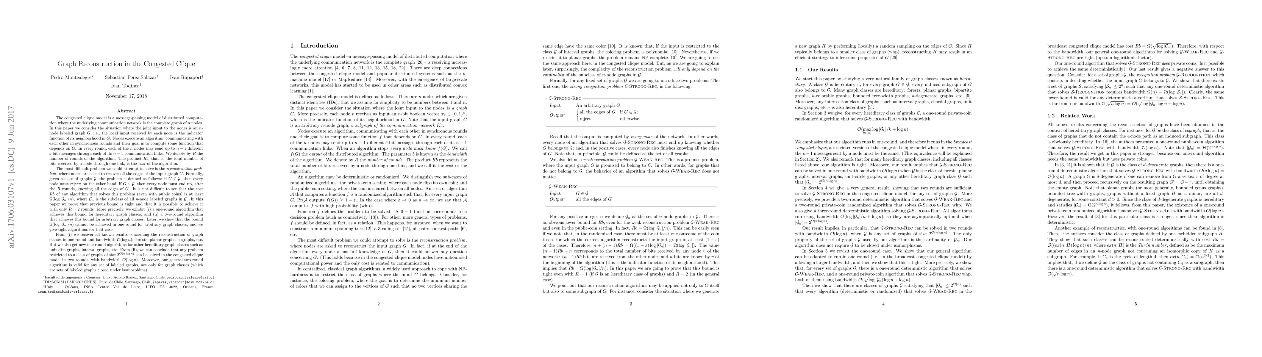 The congested clique model is a message-passing model of distributed computation where the underlying communication network is the complete graph of $n$ nodes. In this paper we consider the situation where the joint input to the nodes is an $n$-node labeled graph $G$, i.e., the local input received by each node is the indicator function of its neighborhood in $G$. Nodes execute an algorithm, communicating with each other in synchronous rounds and their goal is to compute some function that depends on $G$. In every round, each of the $n$ nodes may send up to $n-1$ different $b$-bit messages through each of its $n-1$ communication links. We denote by $R$ the number of rounds of the algorithm. The product $Rb$, that is, the total number of bits received by a node through one link, is the cost of the algorithm. The most difficult problem we could attempt to solve is the reconstruction problem, where nodes are asked to recover all the edges of the input graph $G$. Formally, given a class of graphs $\mathcal G$, the problem is defined as follows: if $G \notin {\mathcal G}$, then every node must reject; on the other hand, if $G \in {\mathcal G}$, then every node must end up, after the $R$ rounds, knowing all the edges of $G$. It is not difficult to see that the cost $Rb$ of any algorithm that solves this problem (even with public coins) is at least $\Omega(\log|\mathcal{G}_n|/n)$, where $\mathcal{G}_n$ is the subclass of all $n$-node labeled graphs in $\mathcal G$. In this paper we prove that previous bound is tight and that it is possible to achieve it with only $R=2$ rounds. More precisely, we exhibit (i) a one-round algorithm that achieves this bound for hereditary graph classes; and (ii) a two-round algorithm that achieves this bound for arbitrary graph classes.