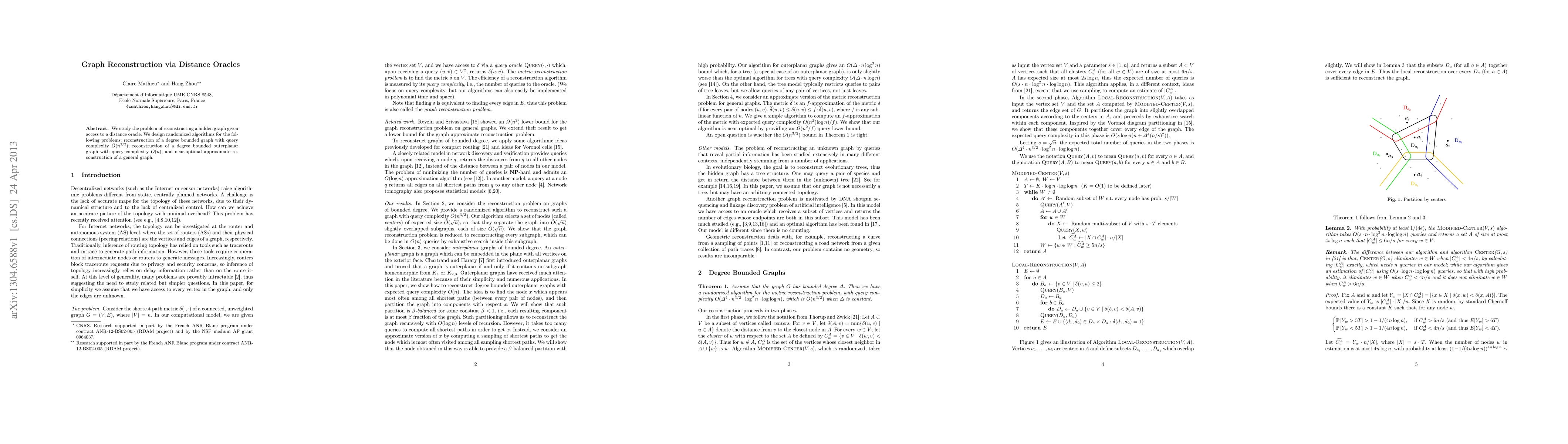 We study the problem of reconstructing a hidden graph given access to a distance oracle. We design randomized algorithms for the following problems: reconstruction of a degree bounded graph with query complexity $\tilde{O}(n^{3/2})$; reconstruction of a degree bounded outerplanar graph with query complexity $\tilde{O}(n)$; and near-optimal approximate reconstruction of a general graph.