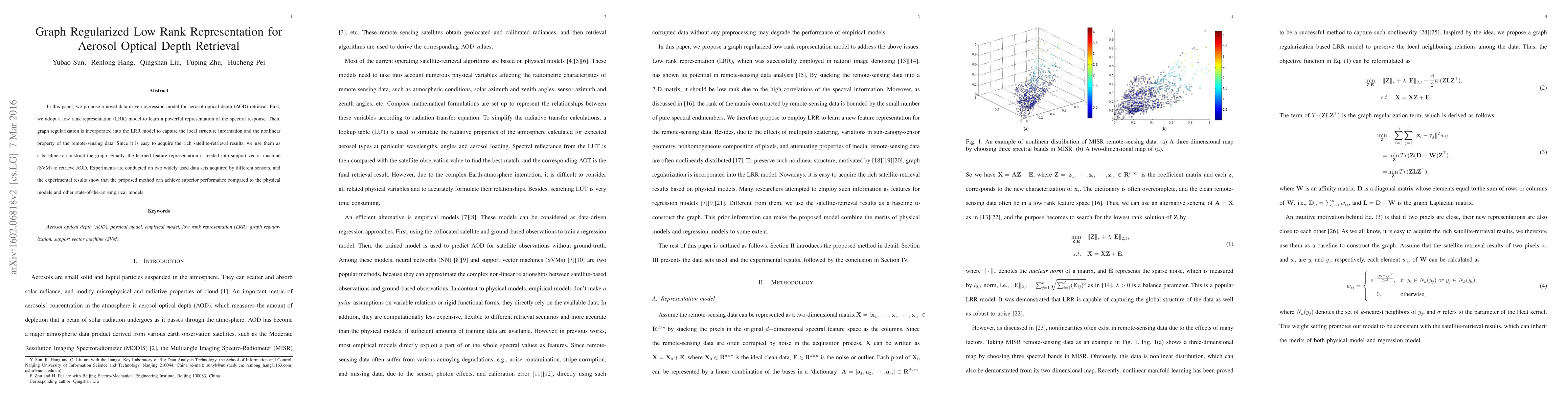 This paper proposes a graph regularized low rank representation model for aerosol optical depth retrieval, combining low rank representation with graph regularization to capture local structure and nonlinear properties, and using SVM for final retrieval, achieving superior performance over physical and other empirical models in experiments.