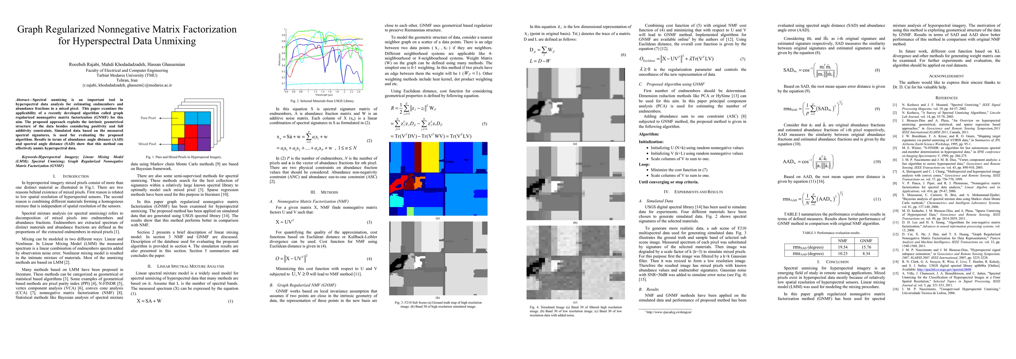Spectral unmixing is an important tool in hyperspectral data analysis for estimating endmembers and abundance fractions in a mixed pixel. This paper examines the applicability of a recently developed algorithm called graph regularized nonnegative matrix factorization (GNMF) for this aim. The proposed approach exploits the intrinsic geometrical structure of the data besides considering positivity and full additivity constraints. Simulated data based on the measured spectral signatures, is used for evaluating the proposed algorithm. Results in terms of abundance angle distance (AAD) and spectral angle distance (SAD) show that this method can effectively unmix hyperspectral data.