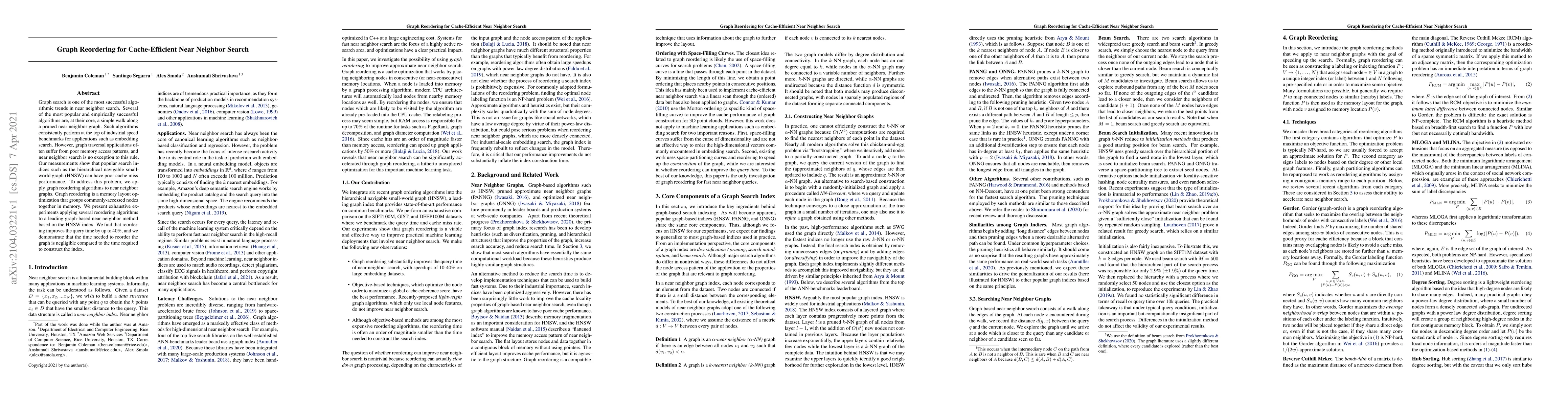 Graph search is one of the most successful algorithmic trends in near neighbor search. Several of the most popular and empirically successful algorithms are, at their core, a simple walk along a pruned near neighbor graph. Such algorithms consistently perform at the top of industrial speed benchmarks for applications such as embedding search. However, graph traversal applications often suffer from poor memory access patterns, and near neighbor search is no exception to this rule. Our measurements show that popular search indices such as the hierarchical navigable small-world graph (HNSW) can have poor cache miss performance. To address this problem, we apply graph reordering algorithms to near neighbor graphs. Graph reordering is a memory layout optimization that groups commonly-accessed nodes together in memory. We present exhaustive experiments applying several reordering algorithms to a leading graph-based near neighbor method based on the HNSW index. We find that reordering improves the query time by up to 40%, and we demonstrate that the time needed to reorder the graph is negligible compared to the time required to construct the index.