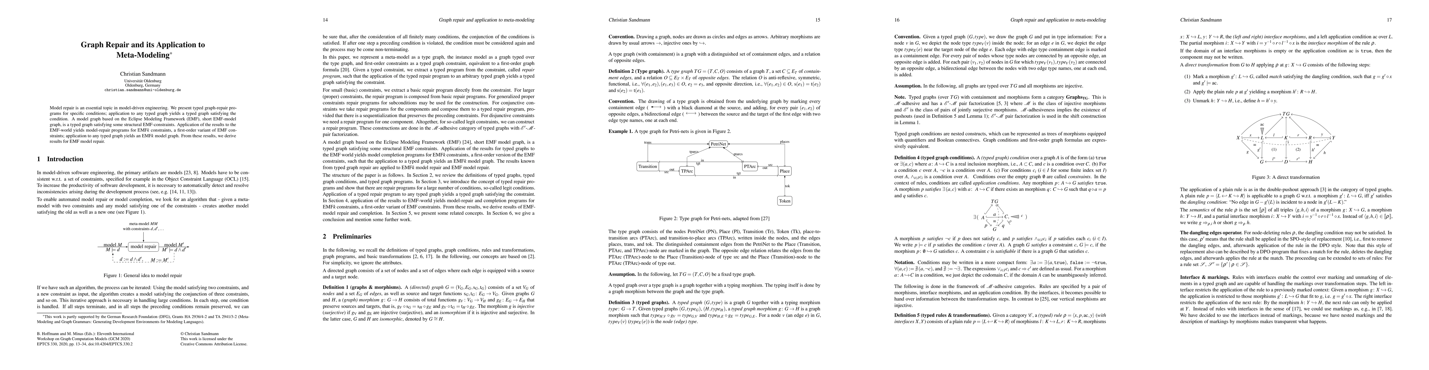 Model repair is an essential topic in model-driven engineering. We present typed graph-repair programs for specific conditions; application to any typed graph yields a typed graph satisfying the condition. A model graph based on the Eclipse Modeling Framework (EMF), short EMF-model graph, is a typed graph satisfying some structural EMF-constraints. Application of the results to the EMF-world yields model-repair programs for EMFk constraints, a first-order variant of EMF constraints; application to any typed graph yields an EMFk model graph. From these results, we derive results for EMF model repair.