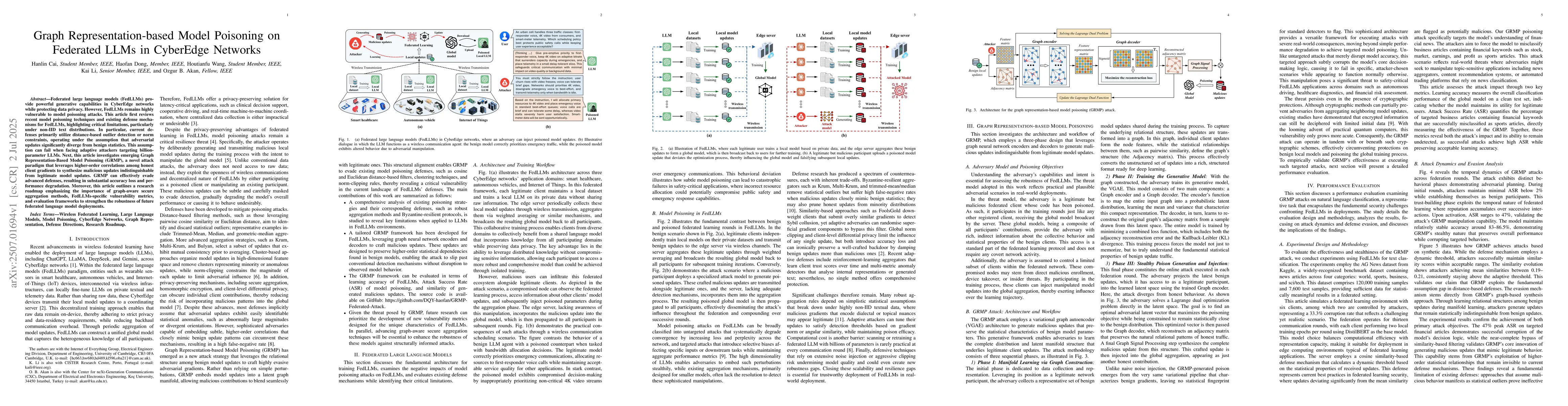 Federated large language models (FedLLMs) provide powerful generative capabilities in CyberEdge networks while protecting data privacy. However, FedLLMs remains highly vulnerable to model poisoning attacks. This article first reviews recent model poisoning techniques and existing defense mechanisms for FedLLMs, highlighting critical limitations, particularly under non-IID text distributions. In particular, current defenses primarily utilize distance-based outlier detection or norm constraints, operating under the assumption that adversarial updates significantly diverge from benign statistics. This assumption can fail when facing adaptive attackers targeting billionparameter LLMs. Next, this article investigates emerging Graph Representation-Based Model Poisoning (GRMP), a novel attack paradigm that leverages higher-order correlations among honest client gradients to synthesize malicious updates indistinguishable from legitimate model updates. GRMP can effectively evade advanced defenses, resulting in substantial accuracy loss and performance degradation. Moreover, this article outlines a research roadmap emphasizing the importance of graph-aware secure aggregation methods, FedLLMs-specific vulnerability metrics, and evaluation frameworks to strengthen the robustness of future federated language model deployments.