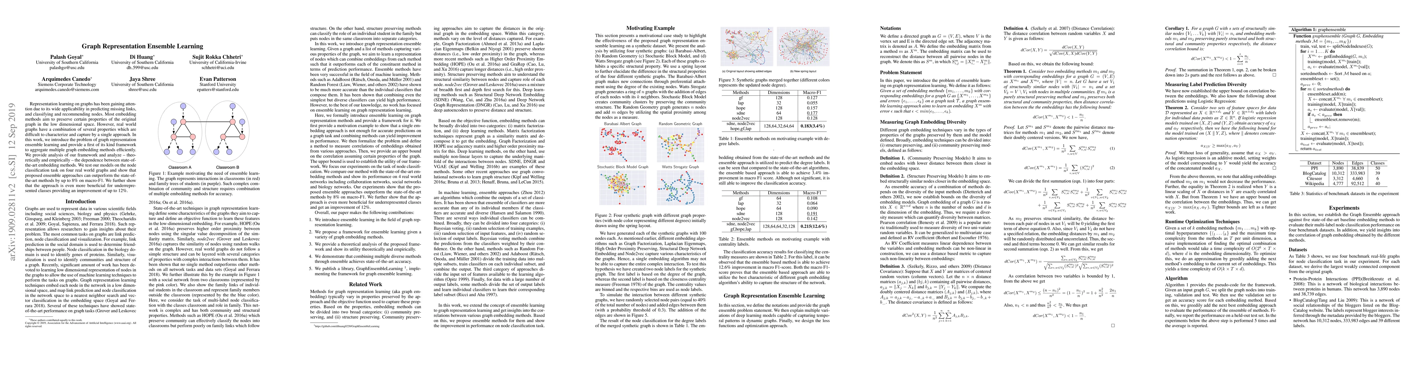 Representation learning on graphs has been gaining attention due to its wide applicability in predicting missing links, and classifying and recommending nodes. Most embedding methods aim to preserve certain properties of the original graph in the low dimensional space. However, real world graphs have a combination of several properties which are difficult to characterize and capture by a single approach. In this work, we introduce the problem of graph representation ensemble learning and provide a first of its kind framework to aggregate multiple graph embedding methods efficiently. We provide analysis of our framework and analyze -- theoretically and empirically -- the dependence between state-of-the-art embedding methods. We test our models on the node classification task on four real world graphs and show that proposed ensemble approaches can outperform the state-of-the-art methods by up to 8% on macro-F1. We further show that the approach is even more beneficial for underrepresented classes providing an improvement of up to 12%.