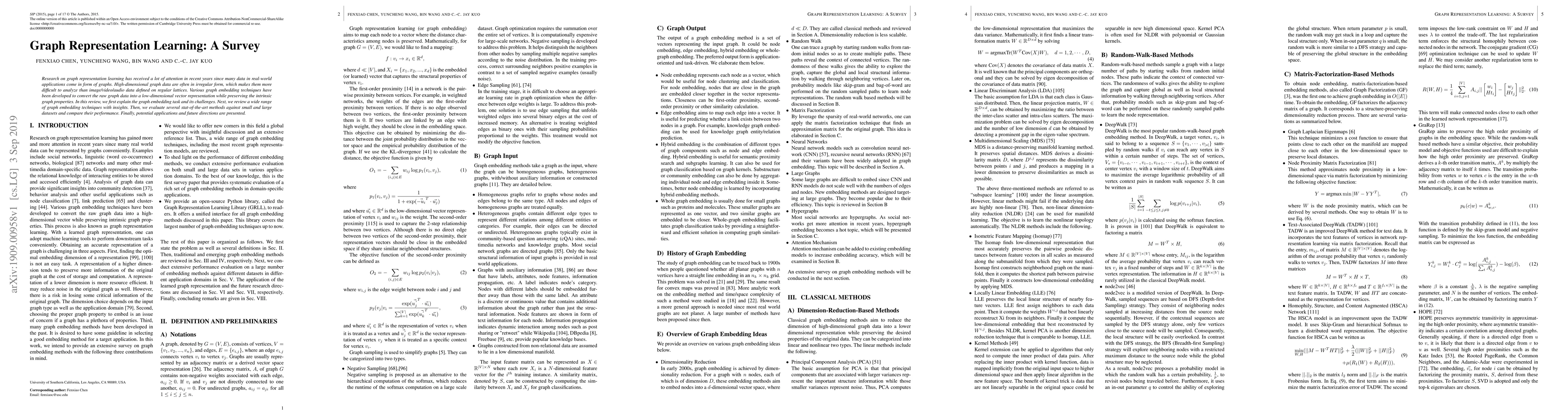 This paper surveys graph representation learning techniques, detailing the challenges of embedding high-dimensional, irregular graph data into low-dimensional vectors while preserving intrinsic properties. It reviews various methods, evaluates state-of-the-art techniques, and discusses potential applications and future research directions.