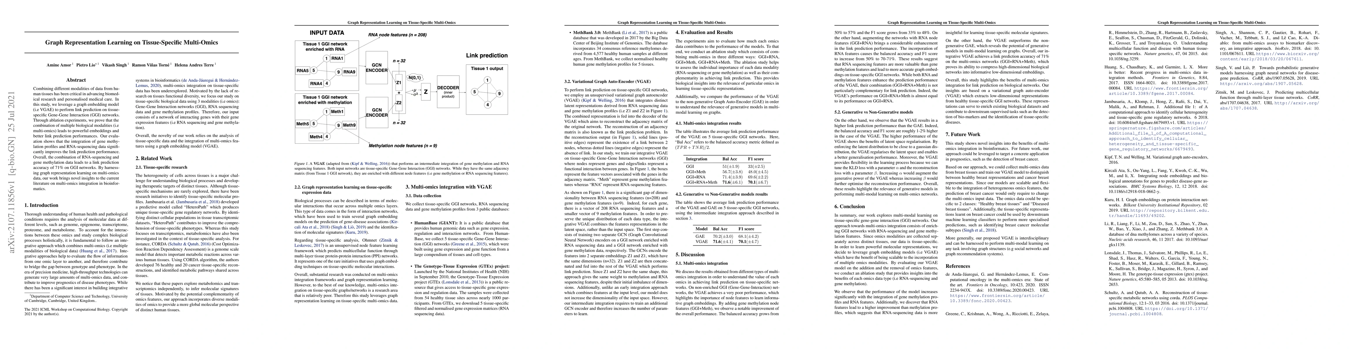 Combining different modalities of data from human tissues has been critical in advancing biomedical research and personalised medical care. In this study, we leverage a graph embedding model (i.e VGAE) to perform link prediction on tissue-specific Gene-Gene Interaction (GGI) networks. Through ablation experiments, we prove that the combination of multiple biological modalities (i.e multi-omics) leads to powerful embeddings and better link prediction performances. Our evaluation shows that the integration of gene methylation profiles and RNA-sequencing data significantly improves the link prediction performance. Overall, the combination of RNA-sequencing and gene methylation data leads to a link prediction accuracy of 71% on GGI networks. By harnessing graph representation learning on multi-omics data, our work brings novel insights to the current literature on multi-omics integration in bioinformatics.