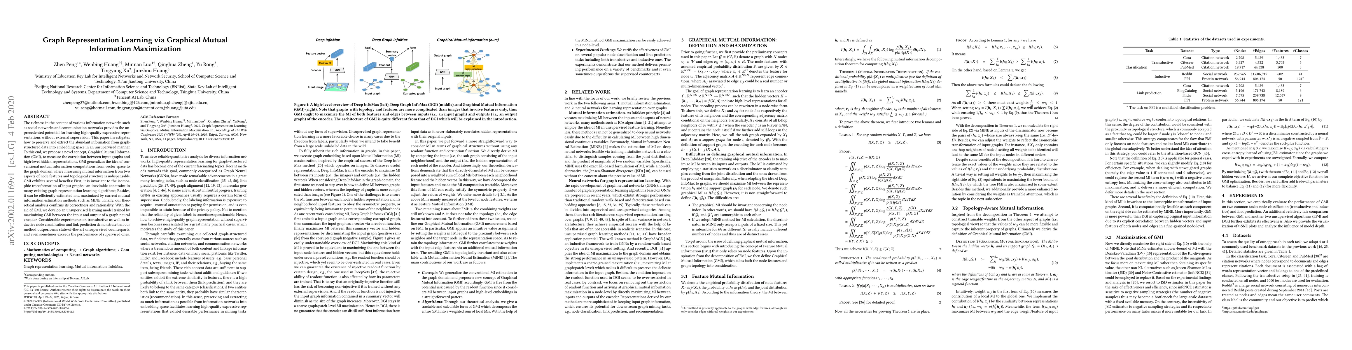 This paper proposes Graphical Mutual Information (GMI) to measure the correlation between input graphs and their representations, enabling unsupervised learning of graph representations. The GMI approach generalizes mutual information to graphs, showing invariance to isomorphism and efficient estimation, and outperforms existing methods in node classification and link prediction tasks.