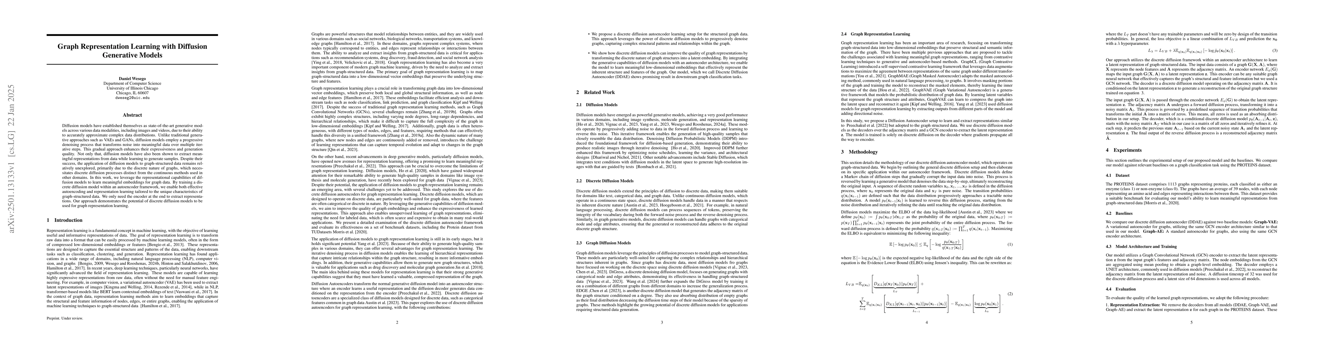 This paper explores applying diffusion models to graph representation learning by developing a discrete diffusion process within an autoencoder framework. The method effectively learns meaningful embeddings for graph data, demonstrating the potential of diffusion models for this domain.
