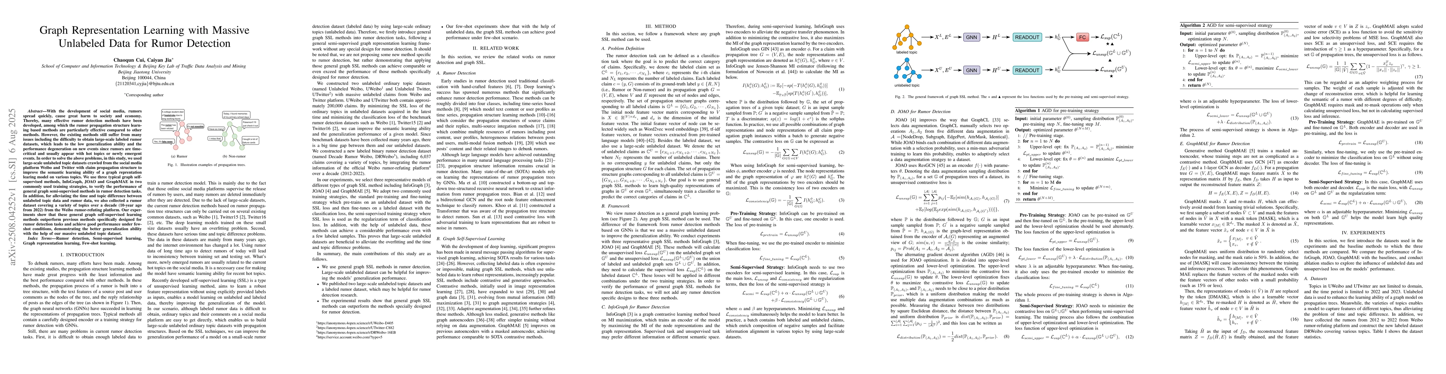 With the development of social media, rumors spread quickly, cause great harm to society and economy. Thereby, many effective rumor detection methods have been developed, among which the rumor propagation structure learning based methods are particularly effective compared to other methods. However, the existing methods still suffer from many issues including the difficulty to obtain large-scale labeled rumor datasets, which leads to the low generalization ability and the performance degeneration on new events since rumors are time-critical and usually appear with hot topics or newly emergent events. In order to solve the above problems, in this study, we used large-scale unlabeled topic datasets crawled from the social media platform Weibo and Twitter with claim propagation structure to improve the semantic learning ability of a graph reprentation learing model on various topics. We use three typical graph self-supervised methods, InfoGraph, JOAO and GraphMAE in two commonly used training strategies, to verify the performance of general graph semi-supervised methods in rumor detection tasks. In addition, for alleviating the time and topic difference between unlabeled topic data and rumor data, we also collected a rumor dataset covering a variety of topics over a decade (10-year ago from 2022) from the Weibo rumor-refuting platform. Our experiments show that these general graph self-supervised learning methods outperform previous methods specifically designed for rumor detection tasks and achieve good performance under few-shot conditions, demonstrating the better generalization ability with the help of our massive unlabeled topic dataset.