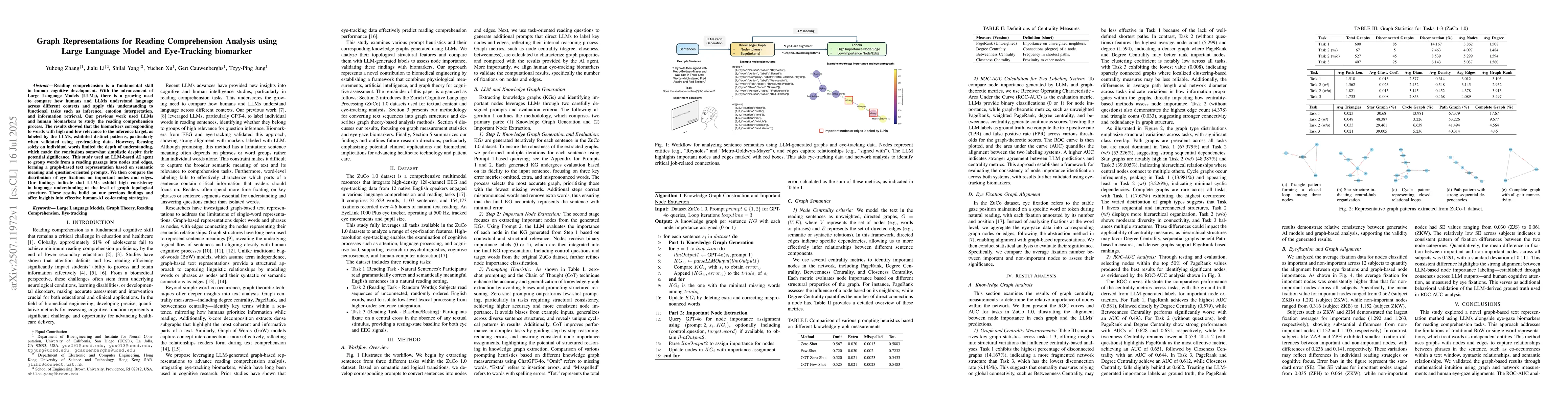 Reading comprehension is a fundamental skill in human cognitive development. With the advancement of Large Language Models (LLMs), there is a growing need to compare how humans and LLMs understand language across different contexts and apply this understanding to functional tasks such as inference, emotion interpretation, and information retrieval. Our previous work used LLMs and human biomarkers to study the reading comprehension process. The results showed that the biomarkers corresponding to words with high and low relevance to the inference target, as labeled by the LLMs, exhibited distinct patterns, particularly when validated using eye-tracking data. However, focusing solely on individual words limited the depth of understanding, which made the conclusions somewhat simplistic despite their potential significance. This study used an LLM-based AI agent to group words from a reading passage into nodes and edges, forming a graph-based text representation based on semantic meaning and question-oriented prompts. We then compare the distribution of eye fixations on important nodes and edges. Our findings indicate that LLMs exhibit high consistency in language understanding at the level of graph topological structure. These results build on our previous findings and offer insights into effective human-AI co-learning strategies.