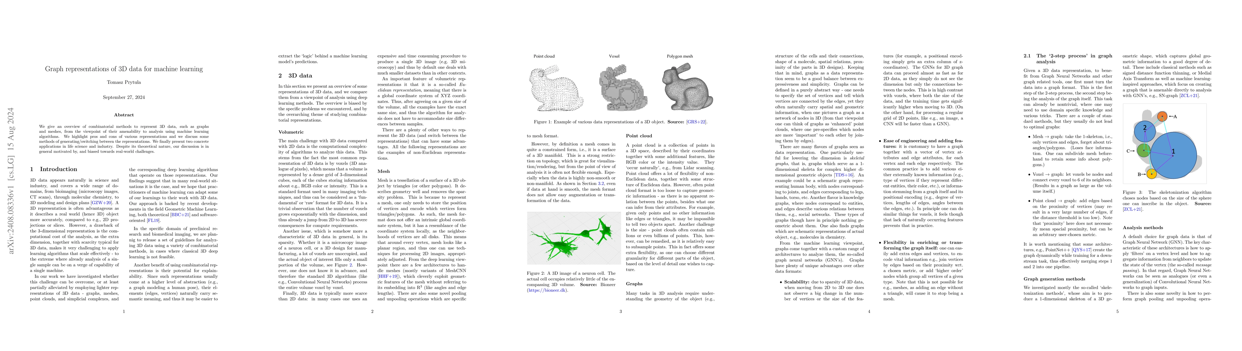 This paper reviews combinatorial methods for representing 3D data as graphs and meshes for machine learning analysis, comparing their advantages and disadvantages and discussing transformation techniques. It also showcases practical applications in life sciences and industry.