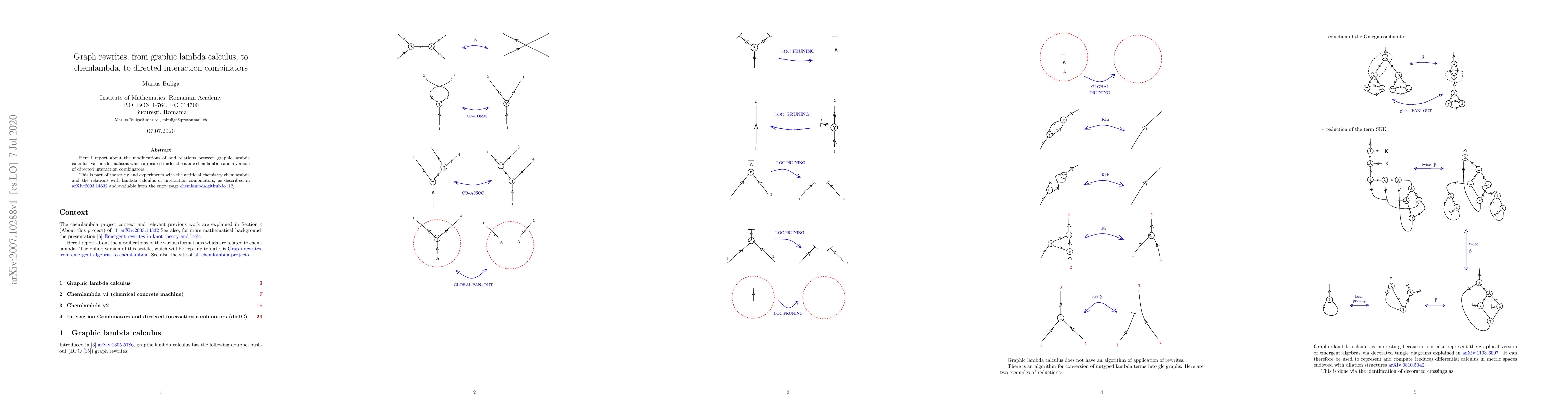 This paper explores the evolution and connections between graphic lambda calculus, chemlambda formalisms, and directed interaction combinators, focusing on the study of artificial chemistry and its relation to lambda calculus and interaction combinators. Further details are available in arXiv:2003.14332 and on the chemlambda website.