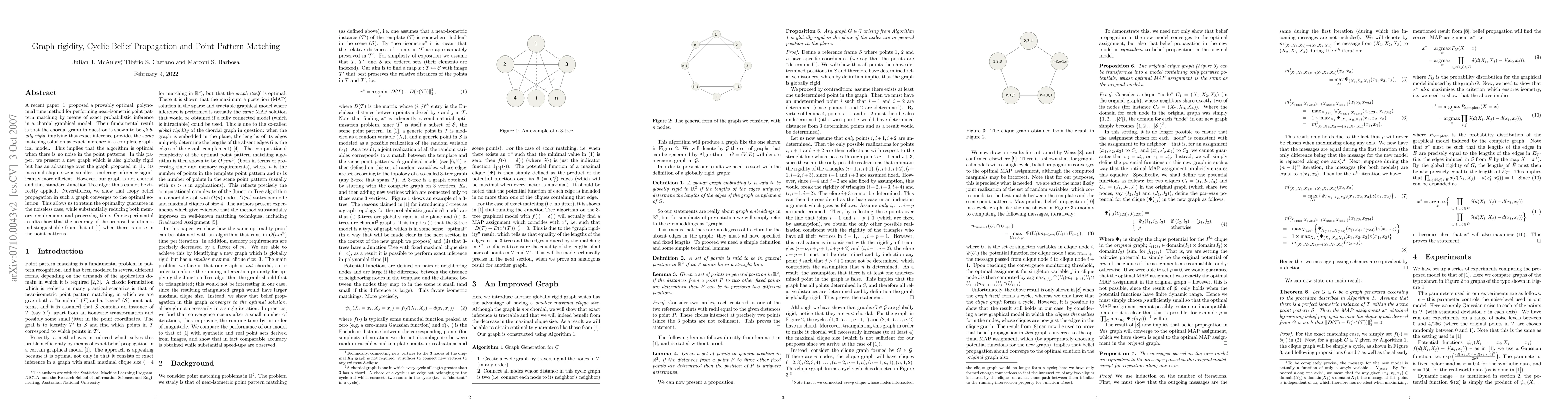 A recent paper \cite{CaeCaeSchBar06} proposed a provably optimal, polynomial time method for performing near-isometric point pattern matching by means of exact probabilistic inference in a chordal graphical model. Their fundamental result is that the chordal graph in question is shown to be globally rigid, implying that exact inference provides the same matching solution as exact inference in a complete graphical model. This implies that the algorithm is optimal when there is no noise in the point patterns. In this paper, we present a new graph which is also globally rigid but has an advantage over the graph proposed in \cite{CaeCaeSchBar06}: its maximal clique size is smaller, rendering inference significantly more efficient. However, our graph is not chordal and thus standard Junction Tree algorithms cannot be directly applied. Nevertheless, we show that loopy belief propagation in such a graph converges to the optimal solution. This allows us to retain the optimality guarantee in the noiseless case, while substantially reducing both memory requirements and processing time. Our experimental results show that the accuracy of the proposed solution is indistinguishable from that of \cite{CaeCaeSchBar06} when there is noise in the point patterns.