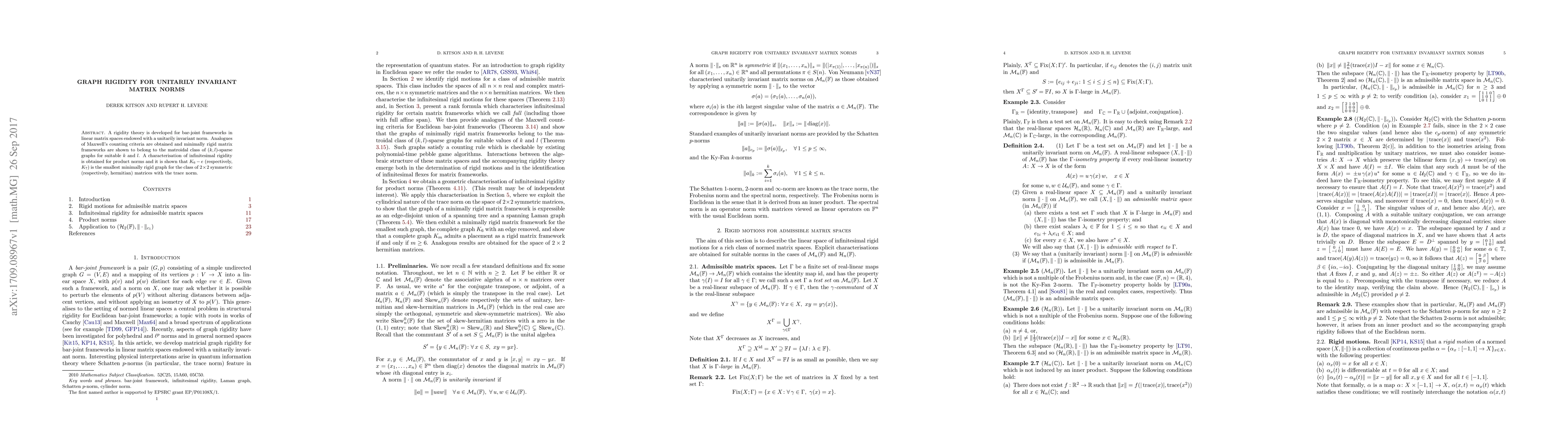 This paper develops a rigidity theory for bar-joint frameworks in matrix spaces with unitarily invariant norms, establishing analogues of Maxwell's criteria and classifying minimally rigid frameworks as matroidal (k,l)-sparse graphs. It also characterizes infinitesimal rigidity for product norms and identifies K_6 - e and K_7 as the smallest minimally rigid graphs for 2x2 trace norm matrices.