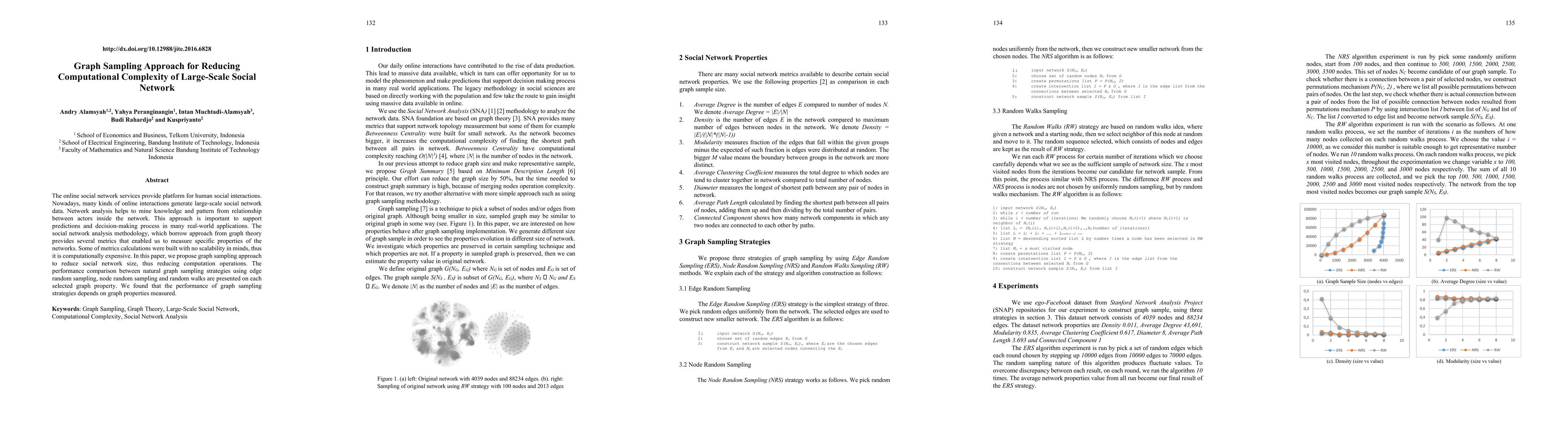 This paper proposes a graph sampling approach to reduce the computational complexity of analyzing large-scale social networks. It compares the performance of different sampling strategies—edge random sampling, node random sampling, and random walks—to determine their effectiveness in preserving selected graph properties.