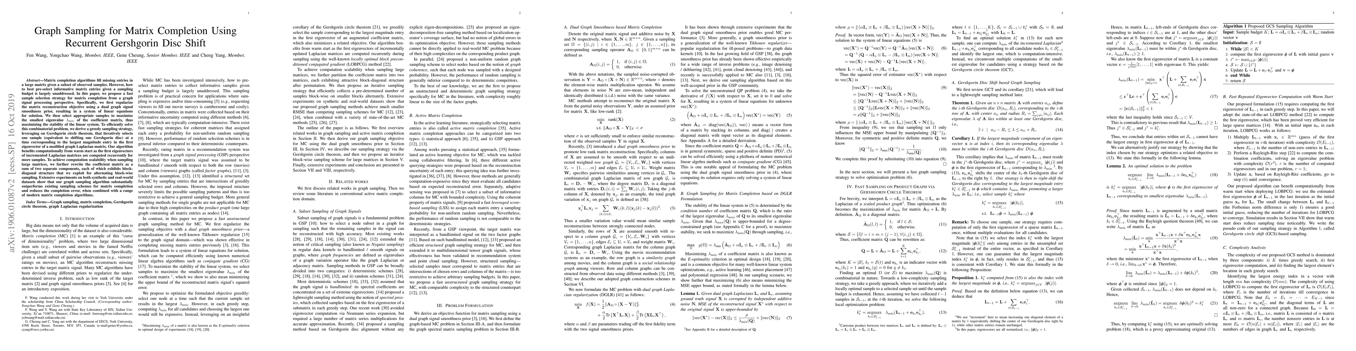 A novel graph sampling strategy for matrix completion is proposed, leveraging Gershgorin circle theorem to efficiently select informative samples that maximize stability of the linear system, outperforming existing schemes in both synthetic and real-world datasets.