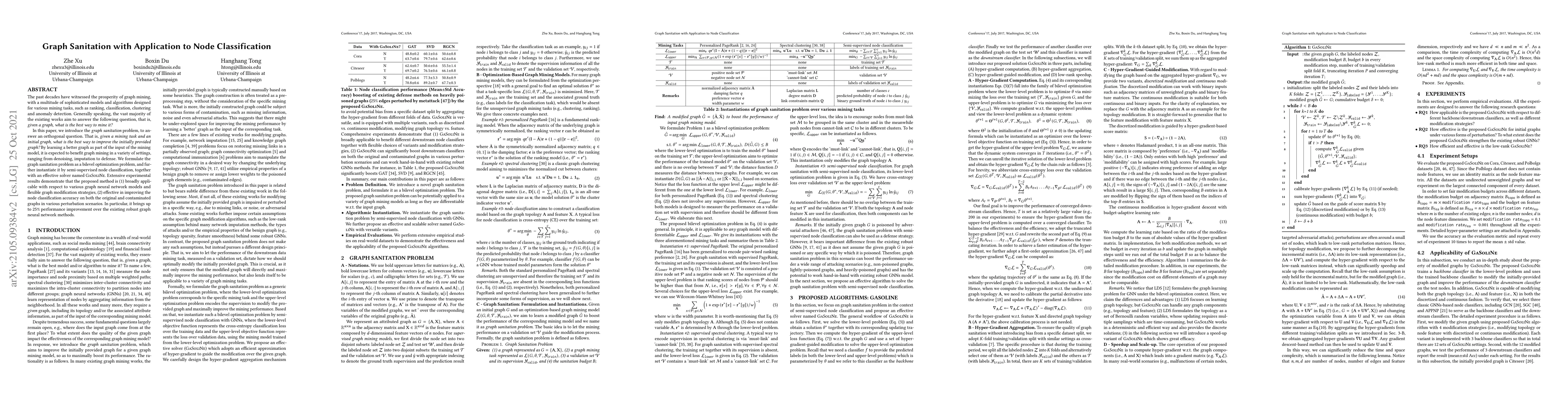 The past decades have witnessed the prosperity of graph mining, with a multitude of sophisticated models and algorithms designed for various mining tasks, such as ranking, classification, clustering and anomaly detection. Generally speaking, the vast majority of the existing works aim to answer the following question, that is, given a graph, what is the best way to mine it? In this paper, we introduce the graph sanitation problem, to answer an orthogonal question. That is, given a mining task and an initial graph, what is the best way to improve the initially provided graph? By learning a better graph as part of the input of the mining model, it is expected to benefit graph mining in a variety of settings, ranging from denoising, imputation to defense. We formulate the graph sanitation problem as a bilevel optimization problem, and further instantiate it by semi-supervised node classification, together with an effective solver named GaSoliNe. Extensive experimental results demonstrate that the proposed method is (1) broadly applicable with respect to different graph neural network models and flexible graph modification strategies, (2) effective in improving the node classification accuracy on both the original and contaminated graphs in various perturbation scenarios. In particular, it brings up to 25% performance improvement over the existing robust graph neural network methods.