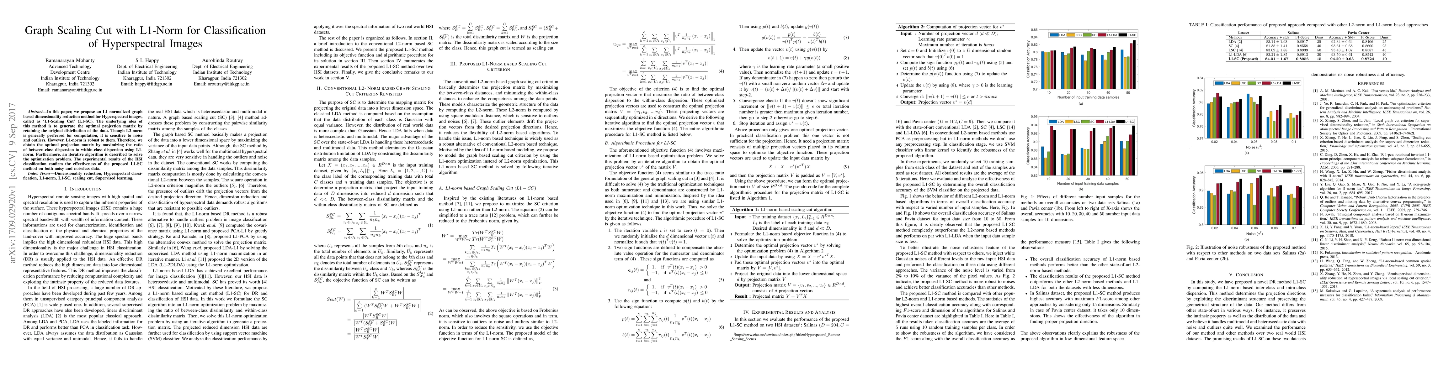 This paper introduces L1-Scaling Cut (L1-SC), an L1-norm based graph dimensionality reduction method for hyperspectral image classification, which is robust to noise and outliers. The method optimizes the projection matrix by maximizing the ratio of between-class to within-class dispersion, demonstrating effective classification performance on both noisy and clean data.