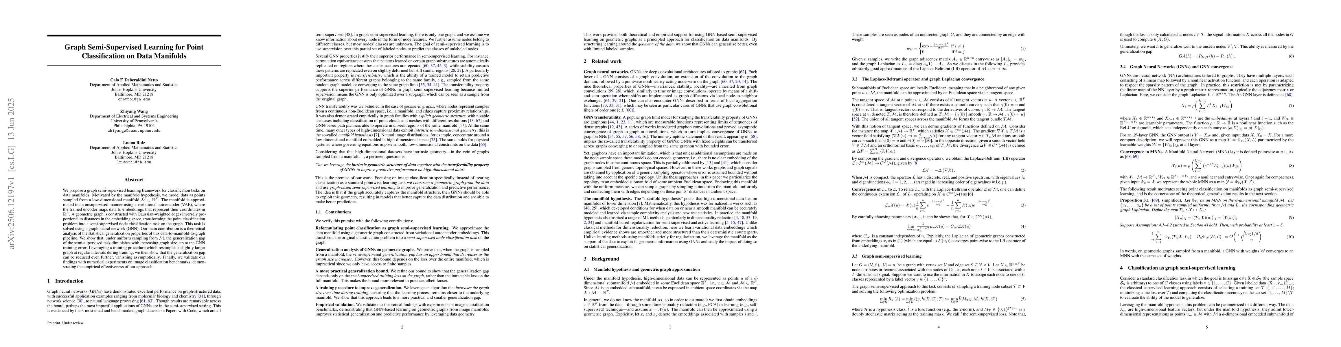 We propose a graph semi-supervised learning framework for classification tasks on data manifolds. Motivated by the manifold hypothesis, we model data as points sampled from a low-dimensional manifold $\mathcal{M} \subset \mathbb{R}^F$. The manifold is approximated in an unsupervised manner using a variational autoencoder (VAE), where the trained encoder maps data to embeddings that represent their coordinates in $\mathbb{R}^F$. A geometric graph is constructed with Gaussian-weighted edges inversely proportional to distances in the embedding space, transforming the point classification problem into a semi-supervised node classification task on the graph. This task is solved using a graph neural network (GNN). Our main contribution is a theoretical analysis of the statistical generalization properties of this data-to-manifold-to-graph pipeline. We show that, under uniform sampling from $\mathcal{M}$, the generalization gap of the semi-supervised task diminishes with increasing graph size, up to the GNN training error. Leveraging a training procedure which resamples a slightly larger graph at regular intervals during training, we then show that the generalization gap can be reduced even further, vanishing asymptotically. Finally, we validate our findings with numerical experiments on image classification benchmarks, demonstrating the empirical effectiveness of our approach.