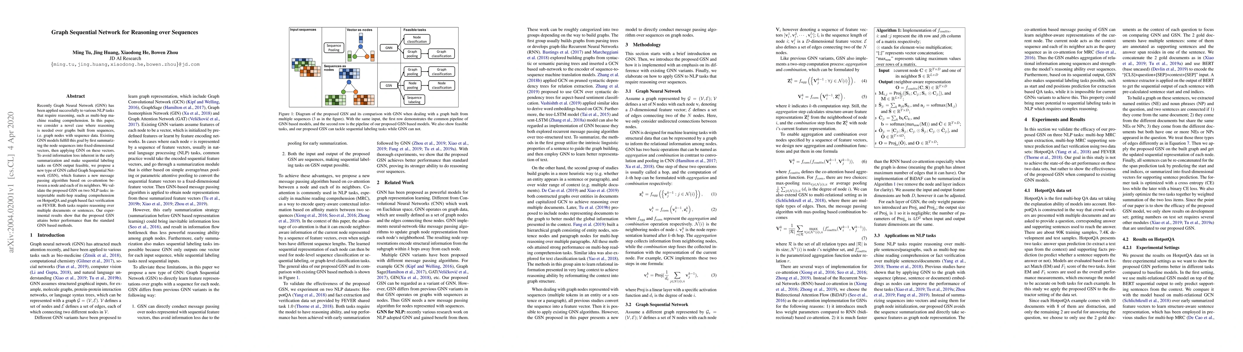 This paper introduces a Graph Sequential Network (GSN) to reason over sequences represented as graph nodes, addressing information loss in traditional GNN models. The GSN employs a co-attention based message passing algorithm, achieving superior performance on multi-hop reading comprehension and graph-based fact verification tasks compared to standard GNN methods.