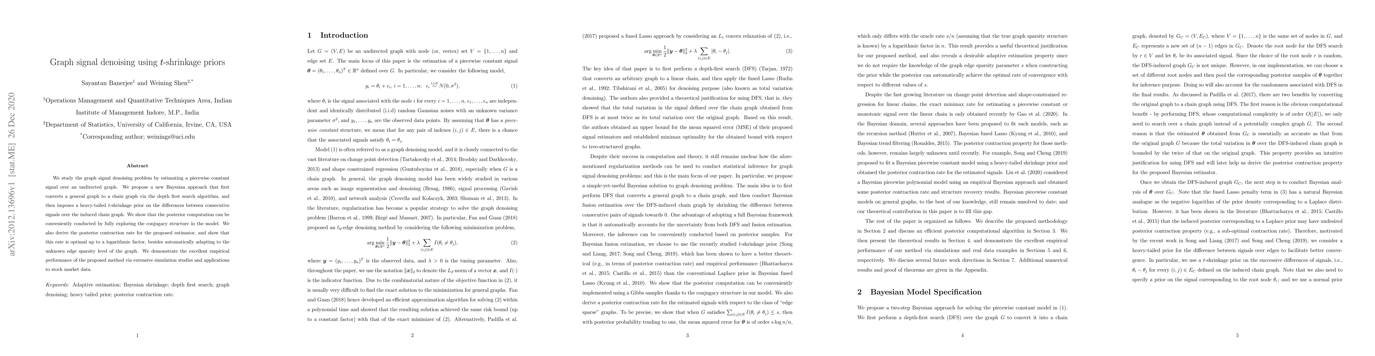 This paper proposes a Bayesian approach for denoising graph signals by converting a general graph to a chain graph and applying a $t$-shrinkage prior. The method leverages conjugacy for efficient posterior computation and demonstrates optimal contraction rate and adaptability to edge sparsity, validated through simulations and stock market data analysis.