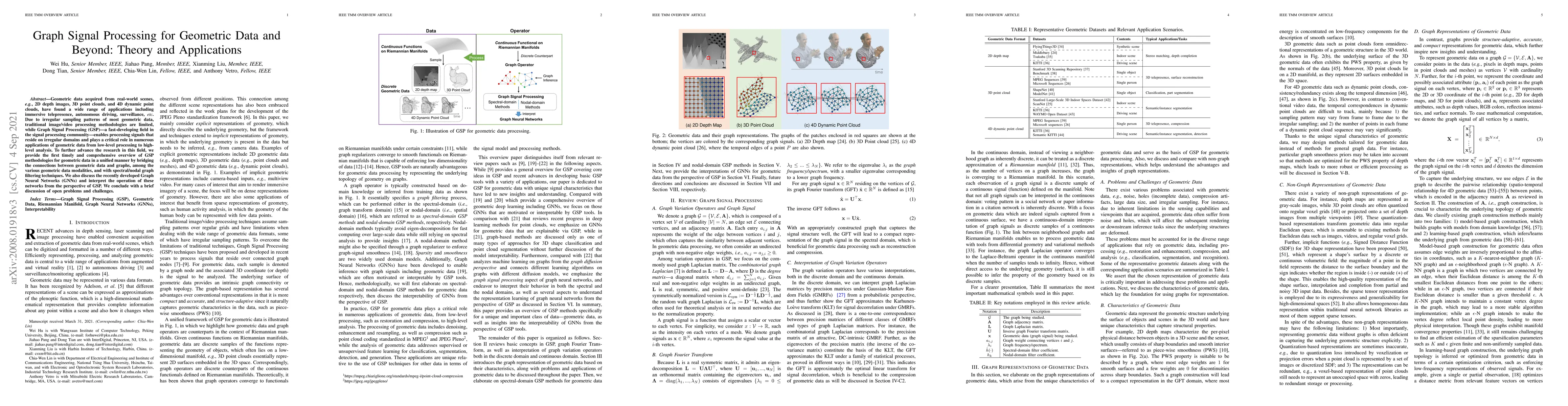 Geometric data acquired from real-world scenes, e.g., 2D depth images, 3D point clouds, and 4D dynamic point clouds, have found a wide range of applications including immersive telepresence, autonomous driving, surveillance, etc. Due to irregular sampling patterns of most geometric data, traditional image/video processing methodologies are limited, while Graph Signal Processing (GSP) -- a fast-developing field in the signal processing community -- enables processing signals that reside on irregular domains and plays a critical role in numerous applications of geometric data from low-level processing to high-level analysis. To further advance the research in this field, we provide the first timely and comprehensive overview of GSP methodologies for geometric data in a unified manner by bridging the connections between geometric data and graphs, among the various geometric data modalities, and with spectral/nodal graph filtering techniques. We also discuss the recently developed Graph Neural Networks (GNNs) and interpret the operation of these networks from the perspective of GSP. We conclude with a brief discussion of open problems and challenges.