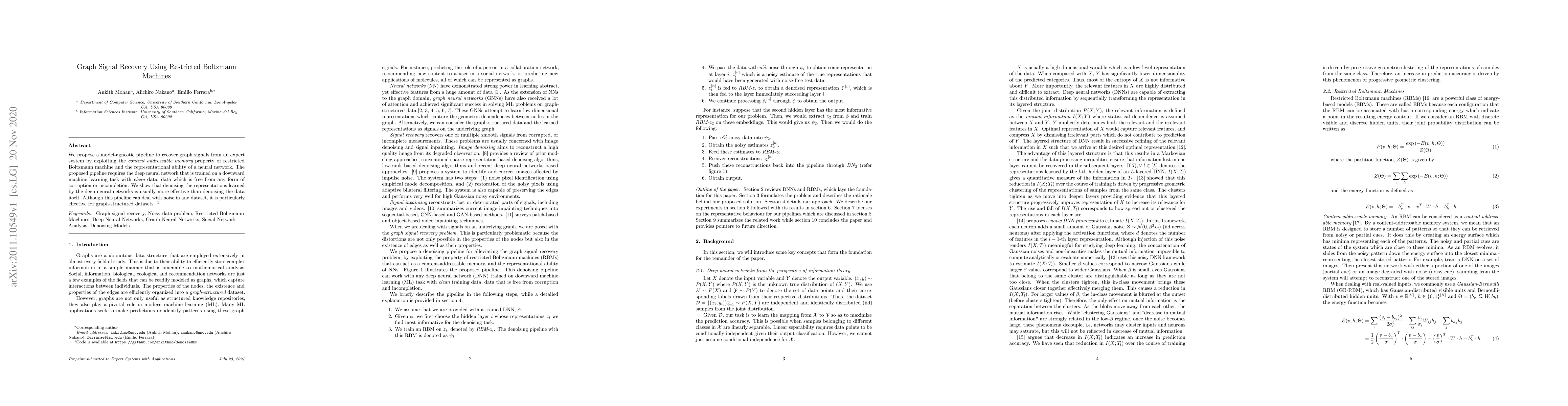 Researchers propose a model-agnostic method to recover graph signals using Restricted Boltzmann Machines, showing it can effectively remove noise from dataset while preserving signal.