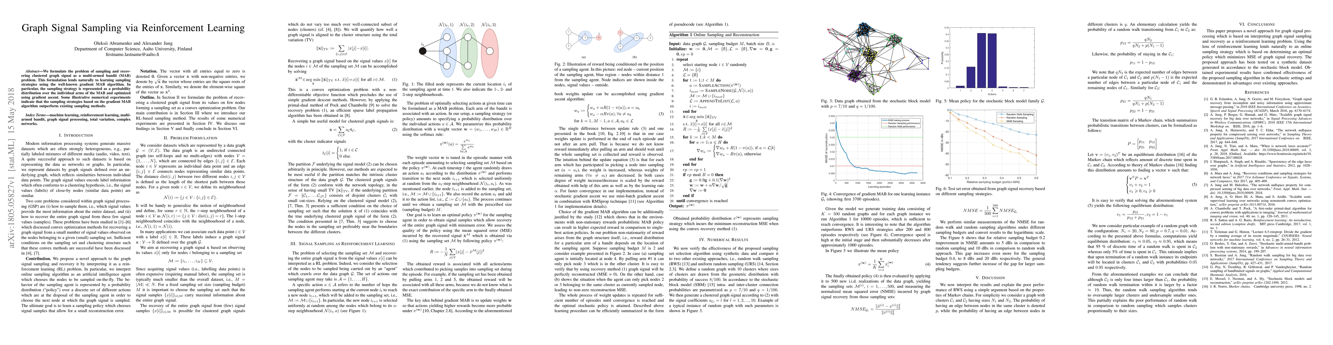 This paper proposes a reinforcement learning approach to sample and recover clustered graph signals by framing the problem as a multi-armed bandit problem, optimizing the sampling strategy using gradient ascent, and demonstrating superior performance over existing methods in numerical experiments.