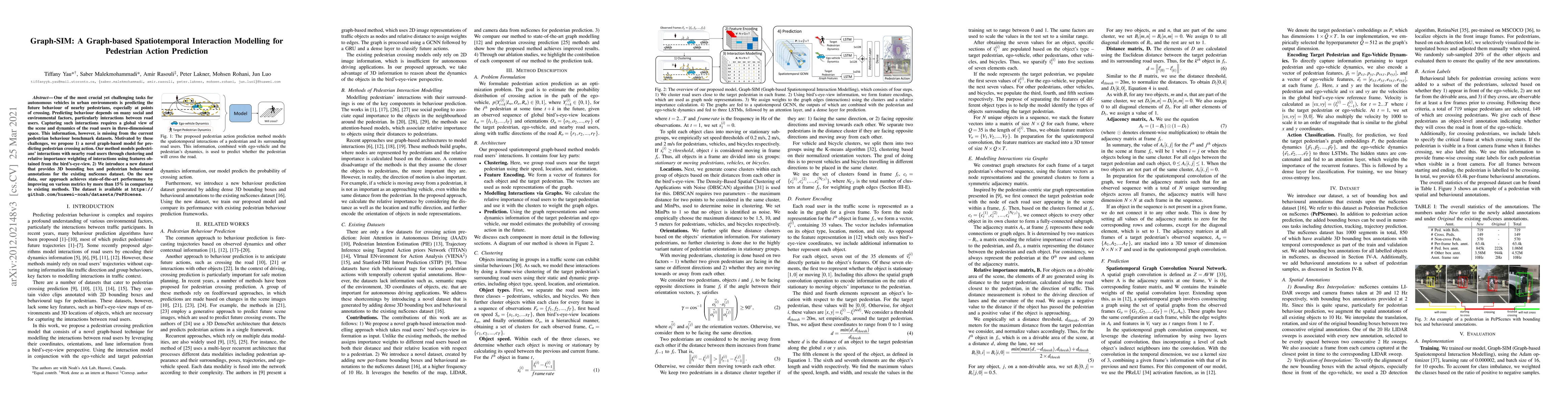 This paper proposes a graph-based spatiotemporal interaction model, Graph-SIM, for predicting pedestrian crossing actions by modeling interactions using a bird's-eye-view. It also introduces a new dataset with 3D annotations for the nuScenes dataset, achieving state-of-the-art performance with a 15% improvement over existing methods.
