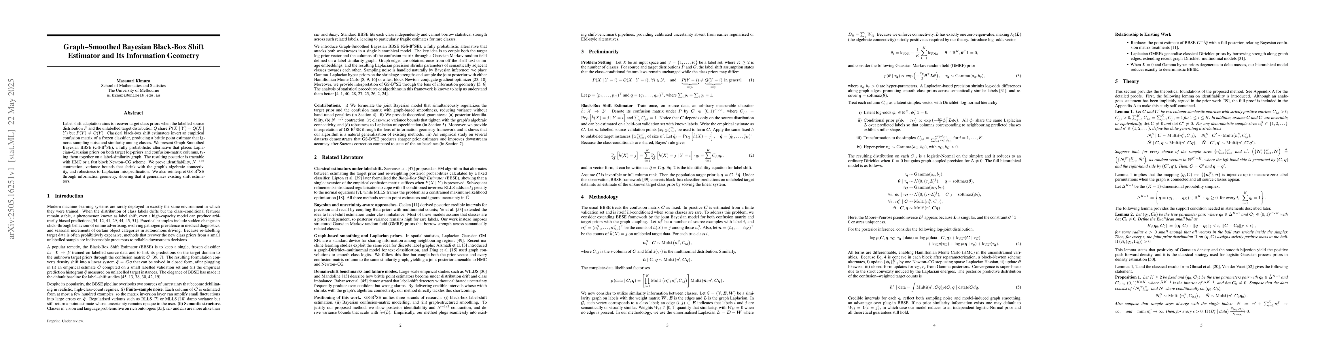 Label shift adaptation aims to recover target class priors when the labelled source distribution $P$ and the unlabelled target distribution $Q$ share $P(X \mid Y) = Q(X \mid Y)$ but $P(Y) \neq Q(Y)$. Classical black-box shift estimators invert an empirical confusion matrix of a frozen classifier, producing a brittle point estimate that ignores sampling noise and similarity among classes. We present Graph-Smoothed Bayesian BBSE (GS-B$^3$SE), a fully probabilistic alternative that places Laplacian-Gaussian priors on both target log-priors and confusion-matrix columns, tying them together on a label-similarity graph. The resulting posterior is tractable with HMC or a fast block Newton-CG scheme. We prove identifiability, $N^{-1/2}$ contraction, variance bounds that shrink with the graph's algebraic connectivity, and robustness to Laplacian misspecification. We also reinterpret GS-B$^3$SE through information geometry, showing that it generalizes existing shift estimators.